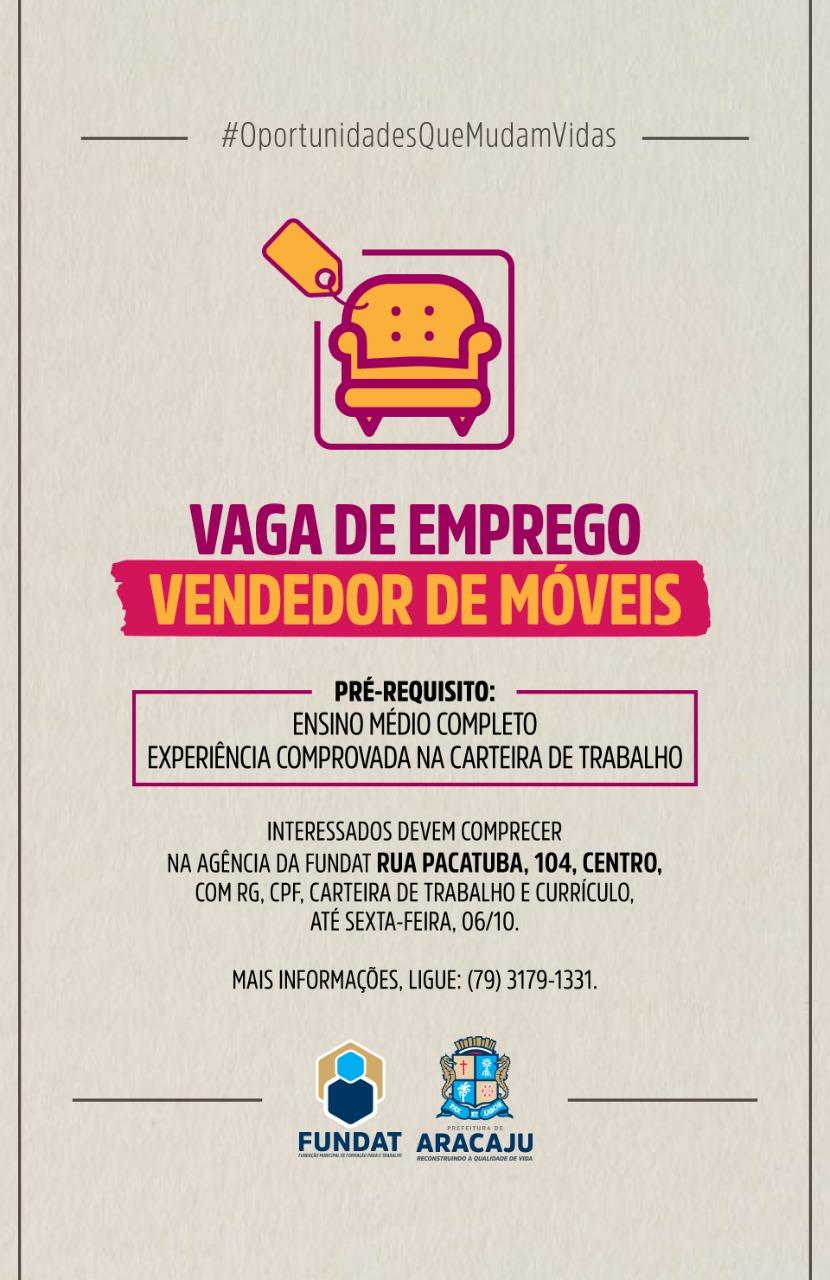 A Fundação Municipal de Formação para o Trabalho (Fundat) está disponibilizando uma oportunidade de emprego para a função de vendedor de móveis. Os interessados em concorrer à vaga precisam ter o Ensino Médio Completo e experiência comprovada na Carteira de Trabalho e Previdência Social (CTPS).