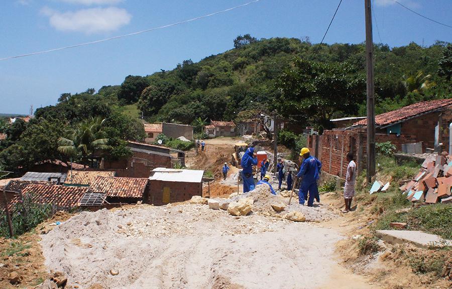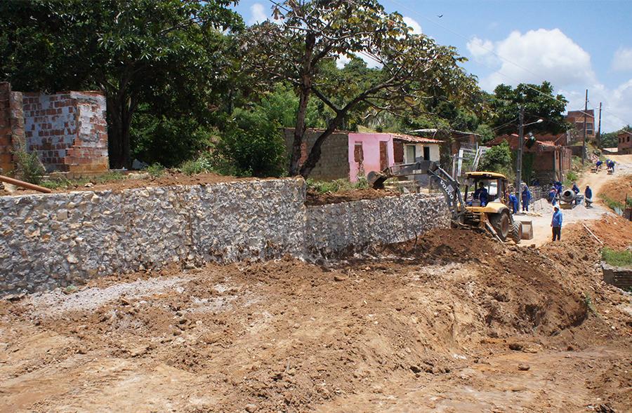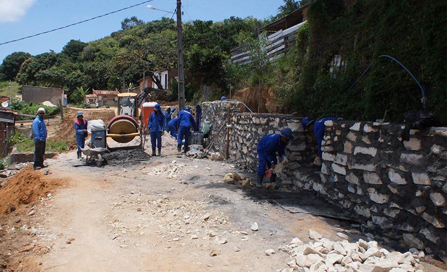 Ao todo cerca de 30 operários trabalham todos os dias na confecção de muros de contenção nas áreas mais íngremes, outras ruas recebem a implantação da rede de drenagem, levantamento topográfico e manejo do solo com máquinas para nivelar e preparar a base para a pavimentação.