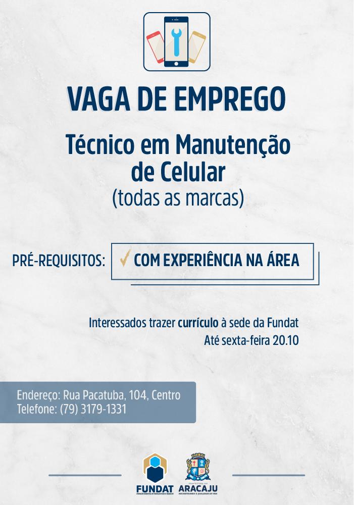 A Fundação Municipal de Formação para o Trabalho (Fundat), por meio da Agência do Trabalhador, está com vaga de emprego para o cargo de técnico em manutenção de celular (todas as marcas). Para participar do processo seletivo, é necessário ter experiência na área.