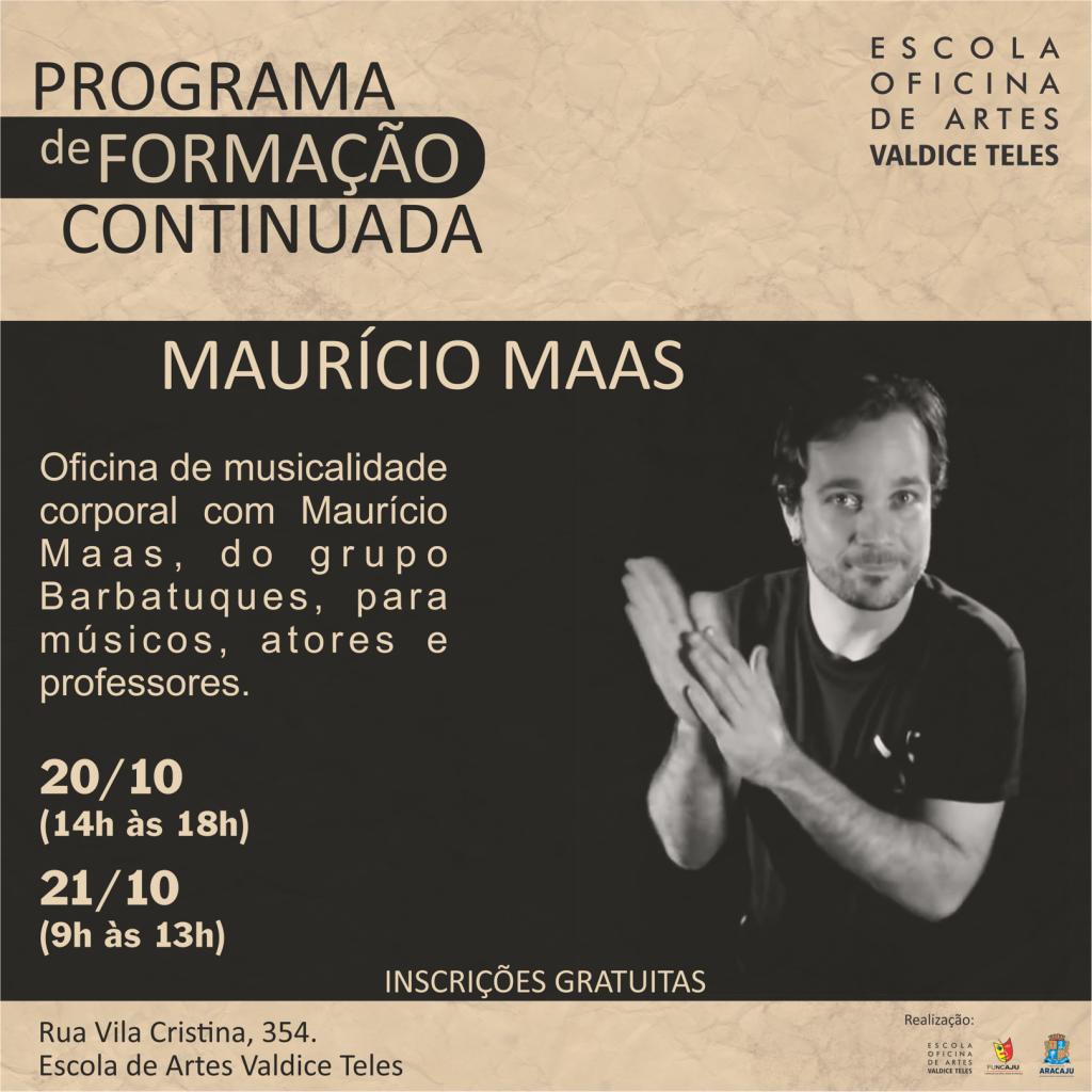 “O Programa de Formação Continuada da Escola de Arte Valdice Teles é uma iniciativa que contempla uma atualização semanal no aprendizado do corpo docente da escola, trazendo parceiros, artistas e educadores para levantar temas diversos, que tenham pertinência aos processos pedagógicos da escola. A oficina de musicalidade corporal com o Maurício Maas está dentro desta perspectiva, que é trocar experiências com os professores da Escola sobre o tema que estamos trabalhando, que é a integração de linguagens dentro da Escola”, explica a coordenadora da Escola de Artes, Giuliana Maria.