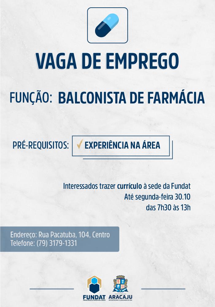 A Fundação Municipal de Formação para o Trabalho (Fundat) está disponibilizando uma oportunidade de emprego para a função de balconista de farmácia. Os interessados em concorrer à vaga precisam ter experiência comprovada na área.