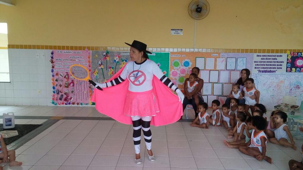 Atuando no papel de Mulher Mosqueteira, a coordenadora pedagógica da Emei, Rita Matos, fez questão de dar vida à heroína que ensina todas as medidas necessárias para evitar a sobrevivência do Aedes aegypti. Segundo ela, “decidimos por esta ação por meio de uma peça teatral pra que, desde cedo, as crianças aprendam a manter sempre o ambiente limpo, porque um ambiente limpo, além de evitar a existência de focos da dengue, faz com que várias outras doenças não apareçam. As crianças aprendem aqui e replicam com os seus pais, saindo daqui cientes elas também podem ajudar na comunidade”, conta.