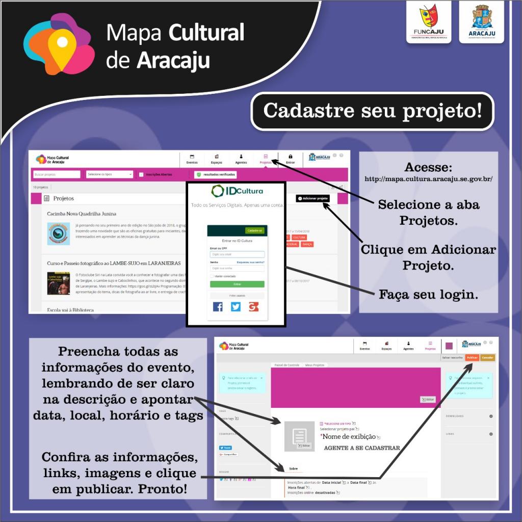 É só acessar o site mapa.cultura.aracaju.se.gov.br. O cadastro é muito fácil: basta clicar em entrar, acesse o menu ID Cultura, clique em cadastre-se, digite suas informações de conta (ou entre pela sua rede social), valide seu endereço acessando sua caixa de e-mail e autorize o acesso as informações. O segundo passo é construir o seu perfil complementando com todas as informações pessoais, de contato, endereço, área de atuação, tags e mídias, confira suas informações, clique em publicar. Feito isso, o cadastro está pronto.