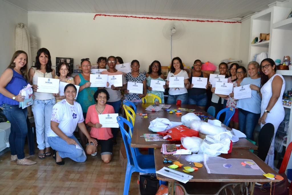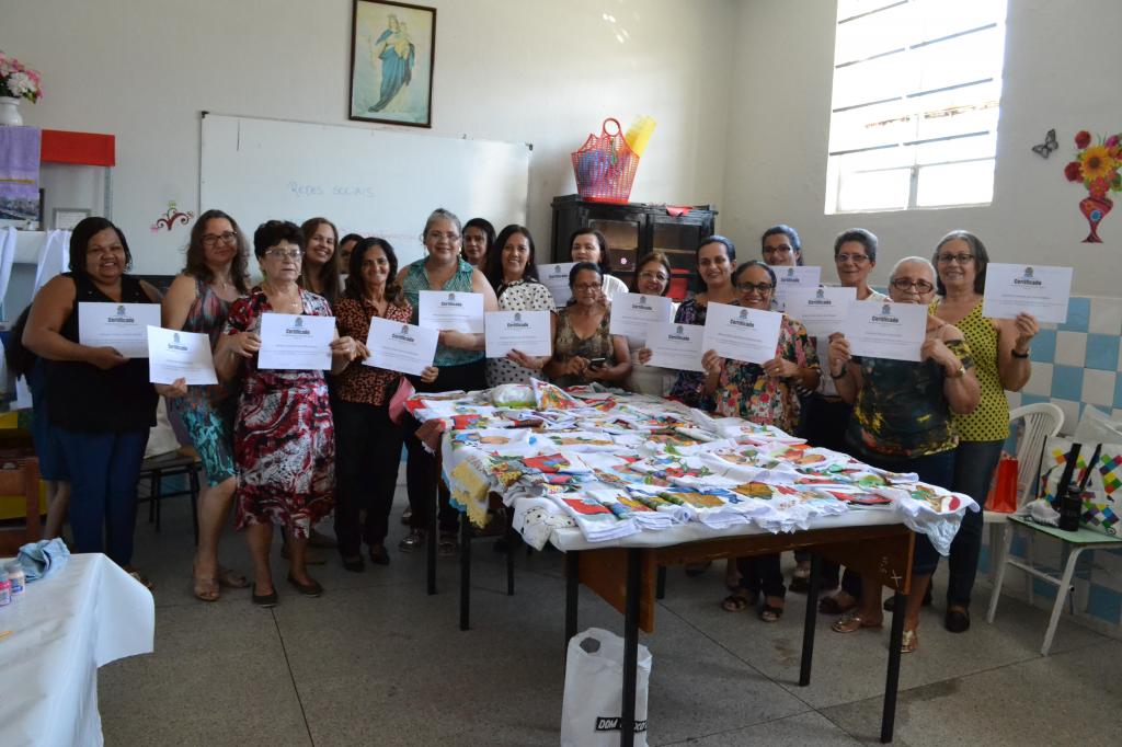 Por esse motivo, foram oferecidos os cursos de Técnicas Básicas de Pintura em Tecido (30h), Técnicas Básicas em Arte em Feltro (30h), Técnicas Básicas em Bolsas Finas (30h), ministrados respectivamente nos parceiros Oratório Nossa Senhora Auxiliadora, Grupo de Assistência à Criança com Câncer (GACC) e Casa Santa Zita. No total, 45 mulheres de várias idades concluíram as capacitações e foram certificadas.