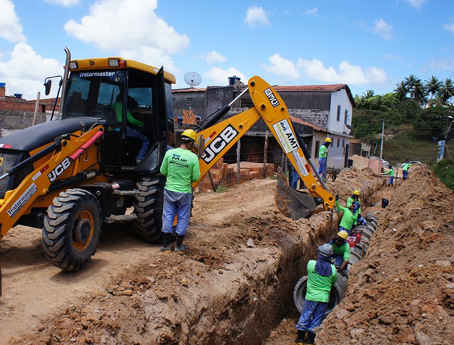 A rede de drenagem está sendo implantada nas ruas das duas partes do loteamento. Cerca de 20 operários trabalham na obra e se dividem entre remoção e nivelamento do terreno, topografia, implantação de drenagem e medições de ruas.