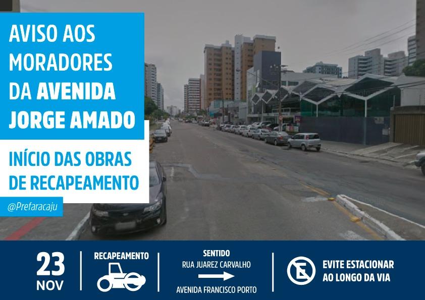 A Prefeitura de Aracaju informa que o programa de recapeamento asfáltico da capital terá continuidade nesta quinta-feira, 23, na avenida Jorge Amado. O local será recapeado a partir da rua Juarez Carvalho, sentido avenida Francisco Porto. A Prefeitura solicita aos moradores que evitem estacionar na via durante este período. Não será necessário o fechamento de toda a avenida.