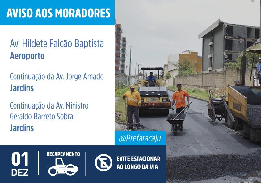 A Prefeitura de Aracaju informa que o Programa de Recapeamento Asfáltico da capital terá continuidade nesta sexta-feira, 1º. O Programa inicia o recapeamento na avenida Hildete Falcão Batista, bairro Aeroporto, e dá continuidade nas avenidas Jorge Amado, bairro Garcia, e na Ministro Geraldo Barreto Sobral, bairro Jardins. A Prefeitura solicita aos moradores que evitem estacionar na via durante este período. Não será necessário o fechamento de toda a avenida.