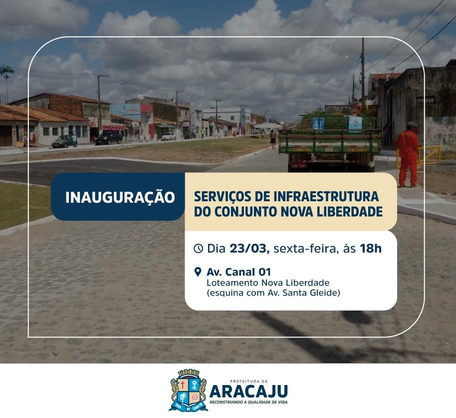 O prefeito Edvaldo Nogueira e o presidente da Empresa Municipal de Obras e Urbanização (Emurb), Sérgio Ferrari, convidam a todos para a inauguração dos serviços de infraestrutura do conjunto Nova Liberdade. O evento ocorrerá nesta sexta-feira, 23, às 18h, na avenida Canal 1, loteamento Nova Liberdade, zona Norte de Aracaju.