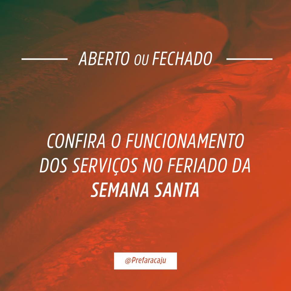 A Prefeitura de Aracaju decretou ponto facultativo na próxima quinta-feira, 29, devido às comemorações da Semana Santa. Em razão disso, alguns serviços municipais terão seus horários de funcionamento alterados. Os órgãos públicos estarão fechados, com exceção dos serviços considerados essenciais e indispensáveis para a cidade.