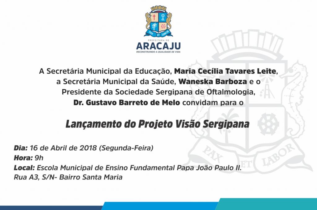 Na próxima segunda- feira, 16, será realizado o lançamento do Projeto Visão Sergipana, uma parceria entre a Prefeitura Municipal de Aracaju, através da Secretaria Municipal da Educação (Semed), Secretaria Municipal da Saúde (SMS) e da Sociedade Sergipana de Oftalmologia (SSO). A solenidade acontecerá na Escola Municipal de Ensino Fundamental Papa João Paulo II, localizada na rua A3, bairro Santa Maria.