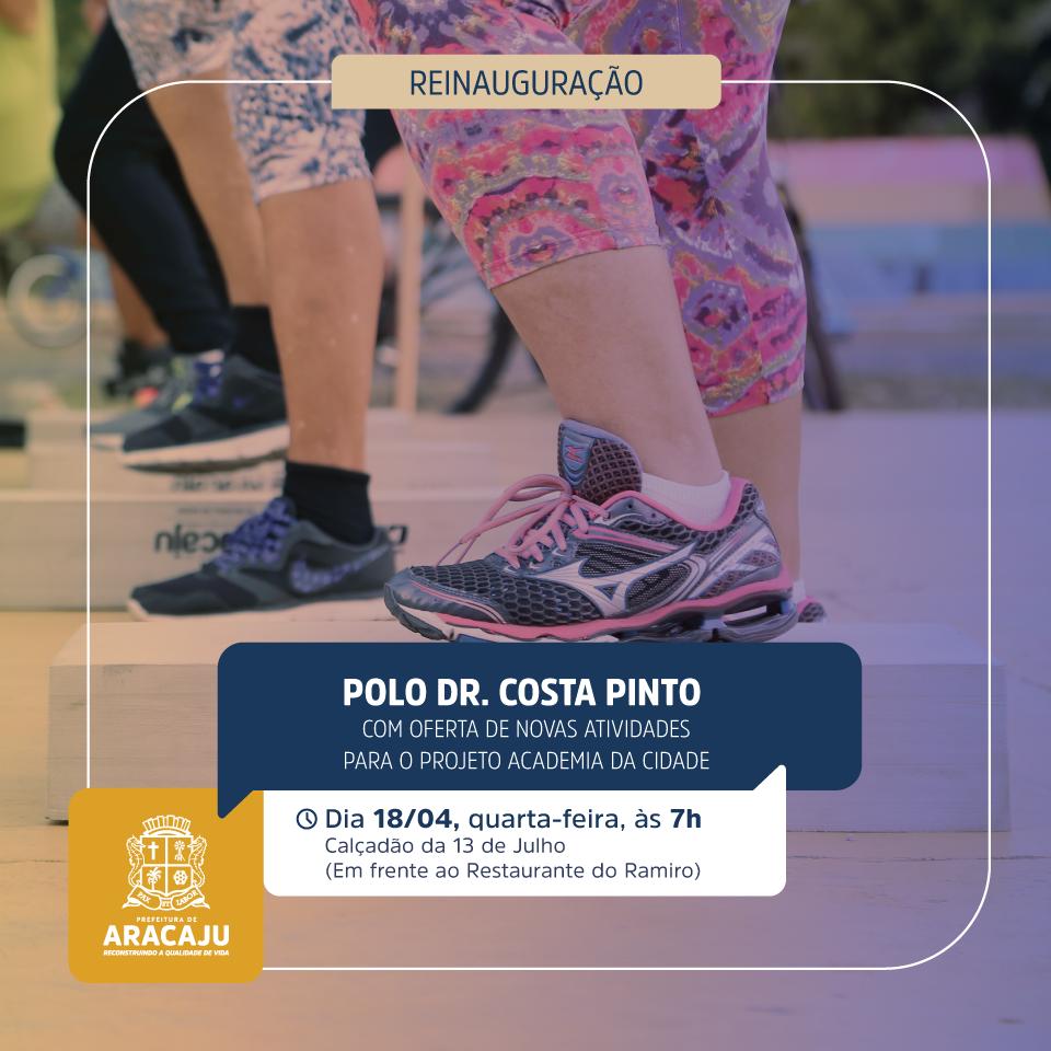 O prefeito Edvaldo Nogueira e a secretária municipal da Saúde, Waleska Barboza, convidam a todos para a solenidade de reinauguração do polo da Academia da Cidade, Dr. Costa Pinto. Na oportunidade, também será anunciada a oferta de novas atividades para o programa. O ato acontecerá nesta quarta-feira, 18, às 7h, no calçadão da 13 de Julho (em frente ao restaurante do Ramiro).