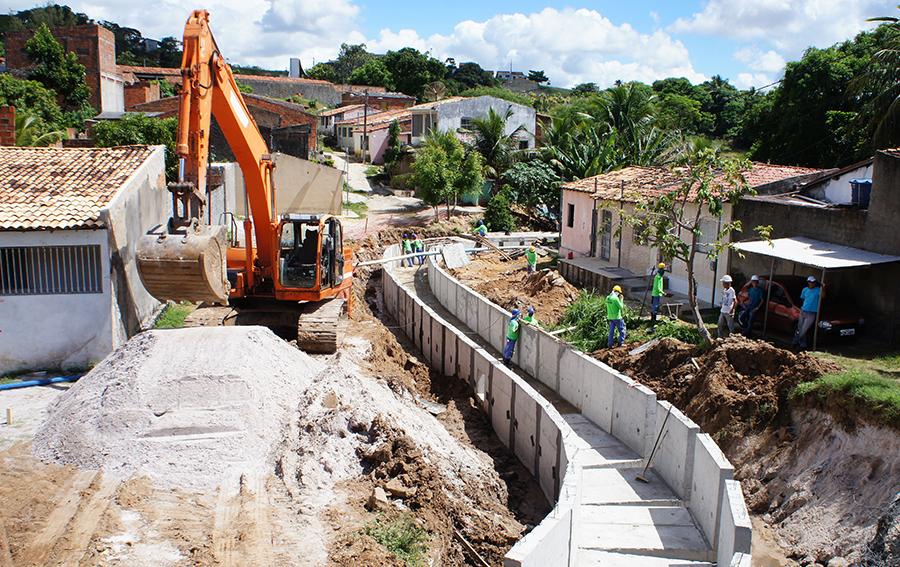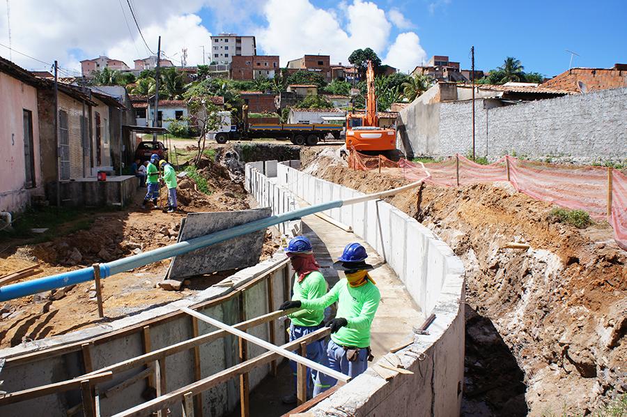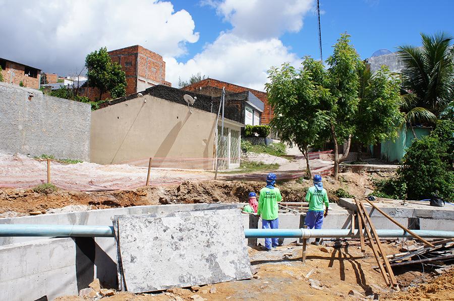 Nos últimos dias, uma vala com 60 metros de extensão que corta a travessa B começou a receber estruturas que resultarão em um canal revestido de concreto com dimensões de dois metros de largura por 1,3 metros de altura. Mais de 20 operários, além de máquinas, trabalham para acelerar o cronograma e avançar no restante da obra.