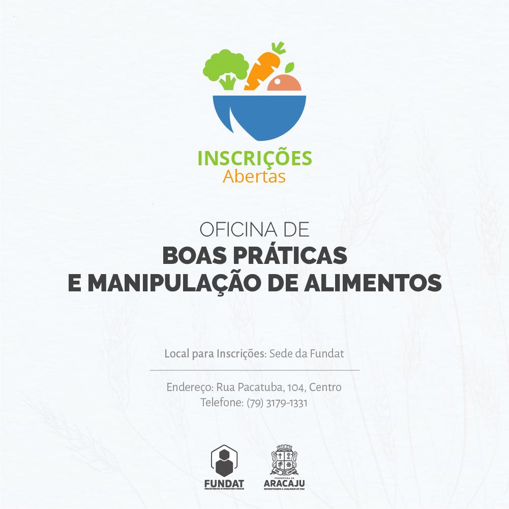 A Fundação Municipal de Formação para o Trabalho (Fundat) informa que já estão abertas as inscrições para a oficina de Boas Práticas de Manipulação de Alimentos (8h), destinada aos ambulantes que trabalharão no período dos festejos juninos. No total, são 400 vagas ofertadas, distribuídas em quatro turmas que acontecerão nos dias 15, 17, 22 e 24 de maio, das 8h às 12h e das 13h às 16h, com intervalo de 1h.