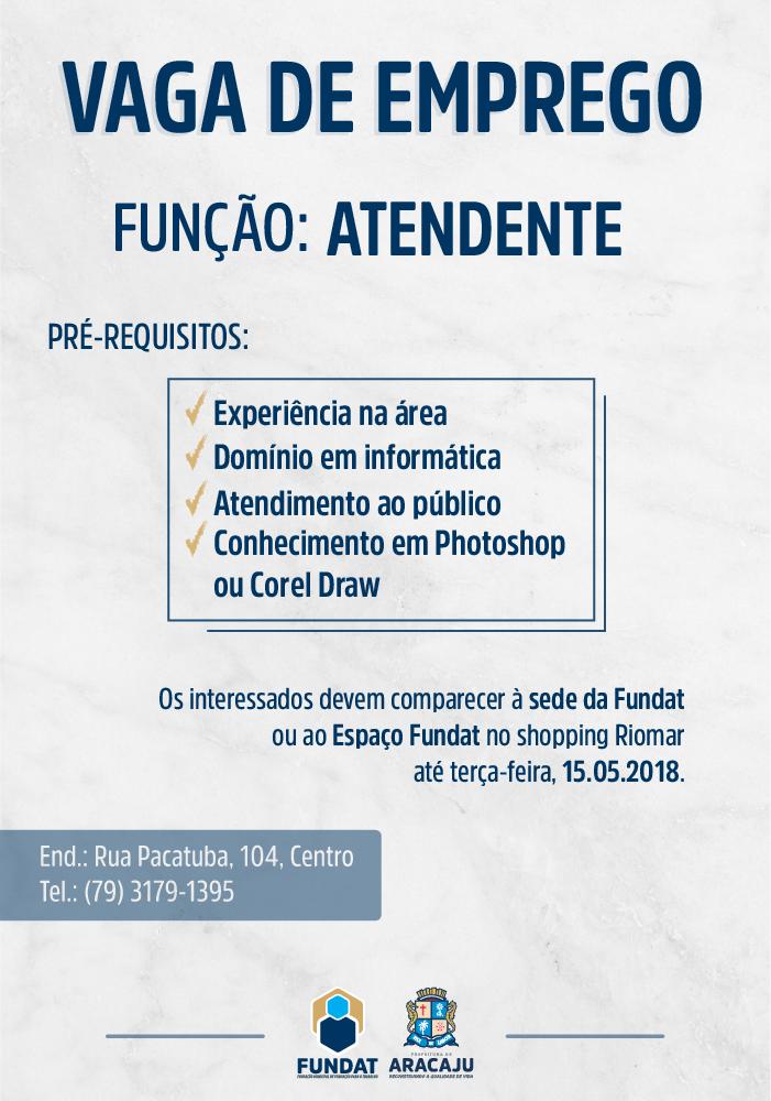 A Agência do Trabalhador, setor da Fundação Municipal de Formação para o Trabalho (Fundat) responsável pelo encaminhamento ao mercado de trabalho, anuncia novas oportunidades de emprego. Desta vez, as vagas ofertadas são para as funções de atendente e vendedor interno. Os interessados em participar dos processos seletivos devem comparecer à sede da Fundat ou ao Espaço Fundat do shopping Riomar, até esta terça-feira, 15 de maio de 2018.
