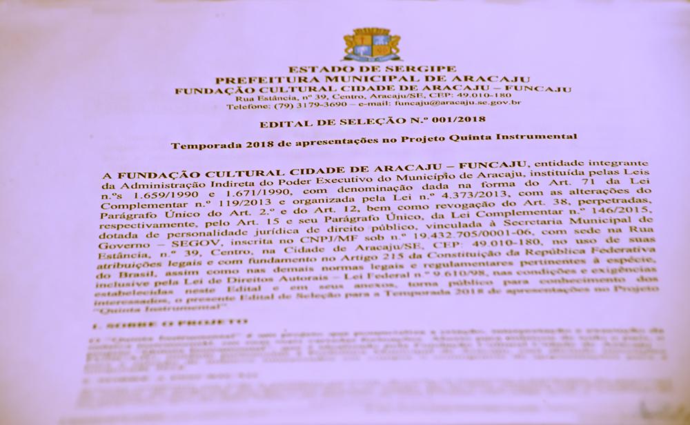 O projeto 'Quinta Instrumental', idealizado pela Fundação de Cultura da Cidade de Aracaju (Funcaju), está com vagas abertas para a contratação de novos músicos, de todo o país, até o dia 6 de junho. Os interessados podem fazer a inscrição preenchendo o formulário disponibilizado pelo Mapa Cultural de Aracaju e enviar para o endereço eletrônico editais.funcaju@aracaju.se.gov.br, com o título ‘Inscrição no Quinta Instrumental’. O resultado será divulgado no site e nas redes sociais da Funcaju no dia 8 de junho.