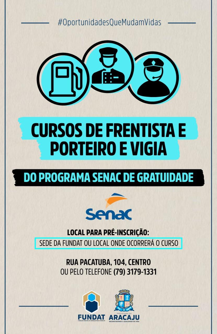 A Fundação Municipal de Formação para o Trabalho (Fundat) inicia o período de pré-matrícula para as capacitações do Programa de Gratuidade do Serviço Nacional de Aprendizagem Comercial (PSG/Senac). Serão duas turmas distribuídas para os cursos de Frentista (160h) e Porteiro e Vigia (160h), que acontecerão na Unidade de Qualificação Profissional (UPQ) do bairro Santos Dumont e no Centro de Integração da Família (Ceinfa), situado no bairro Veneza.