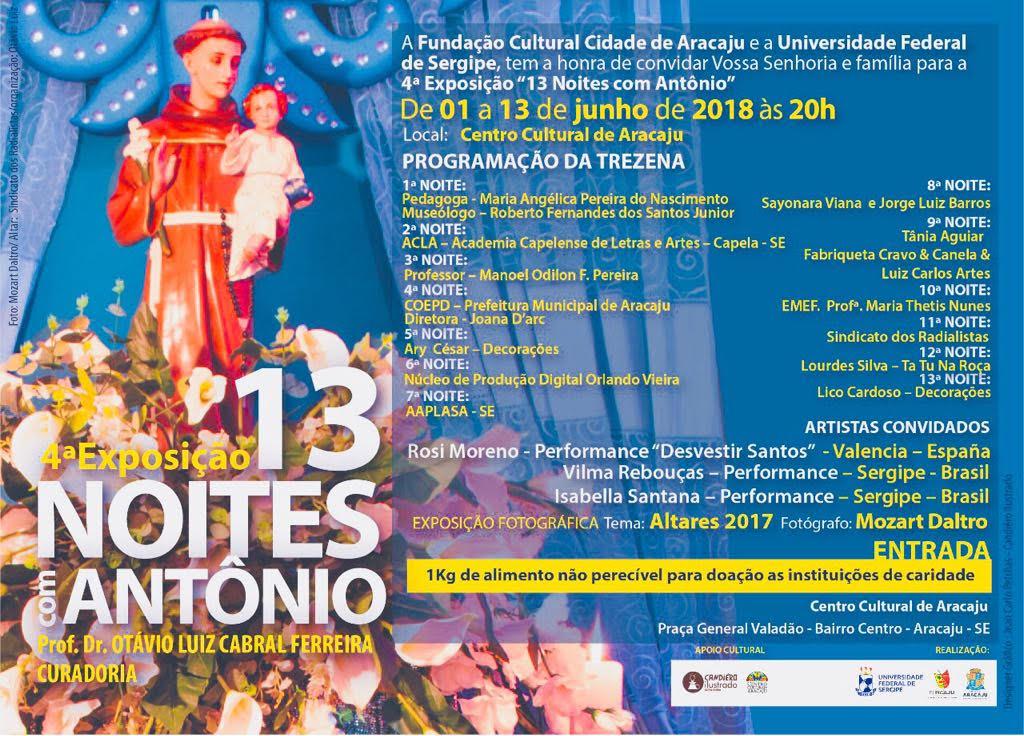 Com o objetivo de recordar os tradicionais altares de orações que se fazem em louvor ao Santo Antônio, a Fundação Cultural Cidade de Aracaju (Funcaju), em parceria com a Universidade Federal de Sergipe (UFS), promove a 4ª Exposição “13 Noites com Antônio”. A programação inicia a partir desta sexta-feira, 1º de junho, até o dia 13, às 20h, no Centro Cultural de Aracaju, localizado na praça General Valadão. A entrada é 1kg de alimento não perecível que será destinado a instituições de caridade.