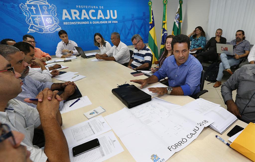 Na manhã desta quarta-feira, 6, os órgãos municipais da Prefeitura de Aracaju realizaram mais uma reunião para preparação do Forró Caju 2018. Os secretários e representantes dos setores responsáveis trataram os detalhes como forma de alinhar as necessidades do evento e garantir uma festa tranquila, segura, confortável e, sobretudo, animada. A situação dos ambulantes, estacionamento, acesso, instalações elétricas, efetivo, segurança, estrutura e saúde foram algumas das temáticas abordadas.
