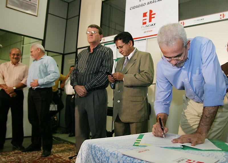 O prefeito de Aracaju, Edvaldo Nogueira, assinou na tarde de hoje, quinta-feira, o termo que firma a doação à Prefeitura Municipal de Aracaju (PMA) de 15 computadores pela Petrobras - Fábrica de Fertilizantes Nitrogenados de Sergipe (Fafen-SE). Os equipamentos serão utilizados pela Fundação Municipal do Trabalho (Fundat) na inclusão digital de jovens e adultos na capital, através de cursos de formação e aperfeiçoamento em informática. A solenidade aconteceu na sede da Fundat e contou com as assinaturas do gerente geral da Fafen-SE, Rosildo Silva, e do presidente da Fundat, Carlos Magno Garcia. Também prestigiaram o evento o secretário municipal de Governo, Bosco Rolemberg, e o vereador Valdir Santos, além de funcionários da Prefeitura de Aracaju. Todos puderam conhecer os computadores doados, que equiparão a nova escola de informática da Fundat no bairro Coroa do Meio. Durante o ato, o prefeito Edvaldo Nogueira ressaltou a importância da parceria. Essa doação une a responsabilidade social da Petrobras, através da Fafen, com o compromisso da Prefeitura. Esses computadores vão contribuir de forma muito importante para que jovens e adultos da Coroa do Meio possam se formar nos cursos, agregar conhecimento útil e entrar com competência e competitividade no mercado de trabalho, comentou. Edvaldo Nogueira ressaltou ainda a importância da Petrobras na história de Aracaju e de Sergipe, relembrando o crescimento que a empresa proporcionou para a população, através de investimentos, geração de emprego e renda, e da parceria em iniciativas de inclusão social. Nossa preocupação é com o cidadão que mais precisa. Esse é um compromisso que compartilhamos com parceiros como a Petrobras, para proporcionar uma vida melhor ao aracajuano, atestou. Essa foi a segunda doação de computadores que a Fafen-SE fez à Fundat em dois anos. Segundo o gerente geral, Rosildo Silva, a medida se enquadra política de responsabilidade social da Petrobras de produzir inclusão digital através de suas unidades em todo o Brasil. Além de criarmos centros de ensino de informática onde a empresa opera, doamos equipamentos pra dar suporte e apoio em outros projetos sociais, como é o caso da Prefeitura, por meio da Fundat, explicou. A instrutora de relações interpessoais da Fundat, Elian Cruz, agradeceu ao prefeito Edvaldo Nogueira pela atenção que vem sendo dada ao bairro Coroa do Meio, do qual ela é presidente da Associação de Moradores. Essa doação é maravilhosa e vai auxiliar decisivamente no crescimento dos estudantes trabalhadores que ali residem. Antes contávamos apenas com a escolinha comunitária de informática, que já não dava conta da demanda, informou. Qualificação Na oportunidade, o presidente da Fundat ressaltou o trabalho que vem sendo feito em prol do trabalhador em Aracaju, inclusive para qualificar os servidores da própria Prefeitura. Tudo que temos feito conta com o aval do prefeito Edvaldo Nogueira. Por isso, é com satisfação que incluímos digitalmente 119 servidores da Fundação, para que eles possam melhor servir à população de Aracaju, reforçou Carlos Magno. Exemplo dessa qualificação é a coordenadora do Centro de Artesanato Chica Chaves, Gizelda Araújo. A servidora explica que tem 23 anos de trabalho na administração municipal, mas foi neste ano que participou pela primeira vez de um curso de informática. Agora me sinto mais valorizada. Sinto-me mais capaz de realizar com autonomia os trabalhos que necessitam do auxílio do computador, revelou.