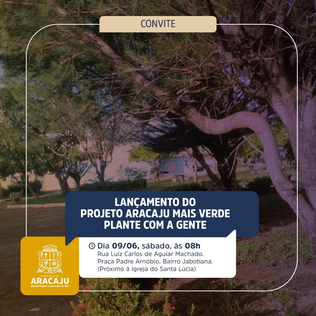 O secretário municipal do Meio Ambiente de Aracaju, Augusto Cesar Viana, convida a todos para o lançamento do projeto Aracaju Mais Verde - Plante com a gente. A ação ocorrerá no dia 9 de junho, sábado, às 8h, na praça Padre Arnóbio, rua Luiz Carlos de Aguiar Machado, bairro Jabotiana, próximo à igreja do Santa Lúcia.