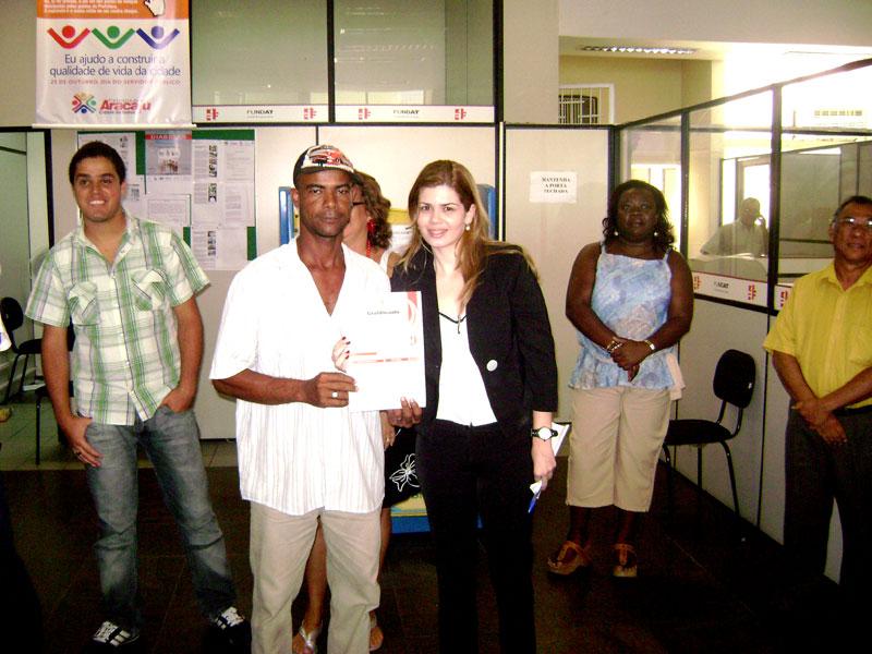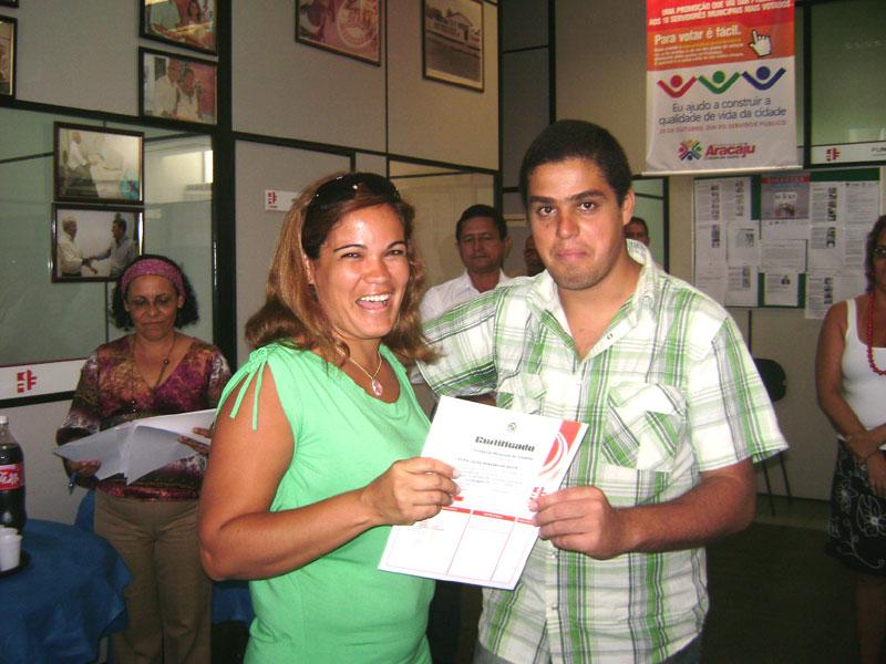 Mais uma turma de servidores da Fundação Municipal do Trabalho (Fundat), concluiu o curso de qualificação profissional. Desta vez, foi o treinamento de informática, realizado em parceria com a Escola do Legislativo. O encerramento e a entrega de certificados aconteceu na manhã de hoje, terça-feira, na sede da Fundat. A inclusão digital foi voltada para motoristas, auxiliares de serviços gerais, assistentes sociais, entre outros profissionais que desempenham diariamente suas funções para fortalecer os serviços oferecidos à população. A emoção tomou conta de alguns dos concludentes, que exibiram orgulhosos seus certificados após mais de dois meses de curso. As aulas aconteceram no horário do expediente, sendo que os servidores se revezaram de acordo com os setores, nos períodos da manhã e tarde, o que não comprometeu o andamento dos trabalhos. O treinamento foi realizado na Escola do Legislativo, sediada na Praça Fausto Cardoso. Segundo o presidente da Fundat, Carlos Magno Costa Garcia, a iniciativa segue o pensamento do prefeito de Aracaju, Edvaldo Nogueira, no que diz respeito à qualificação do servidor. Com essa etapa, concluímos a inclusão digital de todos os servidores da Fundat. A nossa missão é capacitar o cidadão comum e o servidor municipal pois, estando o servidor qualificado, ele também poderá oferecer melhores serviços à comunidade aracajuana, resumiu Carlos Magno. Exemplo dos resultados que a capacitação pode alcançar é do auxiiar de limpeza Antônio Sergio Silva, portador de necessidades especiais na fala e audição. Ele participou do curso de informática e surpreendeu aos instrutores e colegas, obtendo uma das médias mais altas da turma. Ao receber o seu certificado, Antônio Sérgio foi aplaudido pelos colegas e, como sinônimo de agradecimento, usou o símbolo do coração e alguns gestos afirmando que amava a todos e agradecia o carinho a ele dispensado. A assistente social da Fundat, Clara Angélica Almeida Santos, fez uso da palavra para homenagear o professor Maurício Raimundo da Silva, que ministrou aulas no Curso, afirmando que ele é um instrutor especial. Ele entende cada aluno na sua particularidade e, não é à toa que ele também foi nosso colega de Fundação. Obrigada ao presidente desta Fundação que tem se voltado para os servidores. Já o Maurício agradeceu a oportunidade de mais uma vez estar ao lado de pessoas compromissadas em absorver conhecimentos. Vocês foram 10. A diretora da Escola do Legislativo, Graziele Martins, agradeceu a parceria firmada, lembrando que a Fundat é uma instituição que a cada dia se aproxima mais do cidadão aracajuano. Já são mais de 10 turmas que formamos através desta parceria, representando mais de 100 pessoas qualificadas. Aproveito para parabenizar a equipe da Fundat. A coordenadora do Programa de Qualificação Profissional da Fundat, Marta Rocha, citou que a parceria é importante. Emocionada, aproveitou para parabenizar os colegas que concluíram o curso. Na oportunidade, a coordenadora citou que até 31 de outubro, foram qualificadas cinco mil pessoas, atingindo portanto, a meta inicial deste ano. Vamos chegar dezembro com mais 500 cidadãos qualificados, totalizando 5.500 cidadãos treinados.
