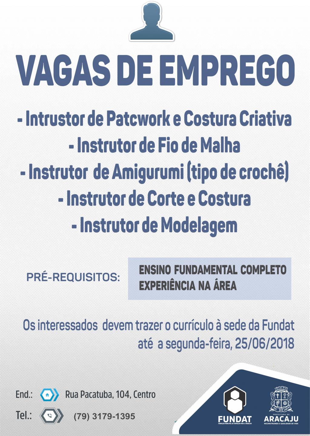 A Fundação Municipal de Formação para o Trabalho (Fundat), através da Agência do Trabalhador, setor responsável pelo encaminhamento ao mercado de trabalho, anuncia mais oportunidades de emprego para o cidadão que está em busca de ingressar ou retornar ao campo profissional. Desta vez, as vagas ofertadas são para instrutor de patchwork e costura criativa; instrutor de fio de malha; instrutor de Amigurumi (tipo de crochê); instrutor de corte e costura e instrutor de modelagem.