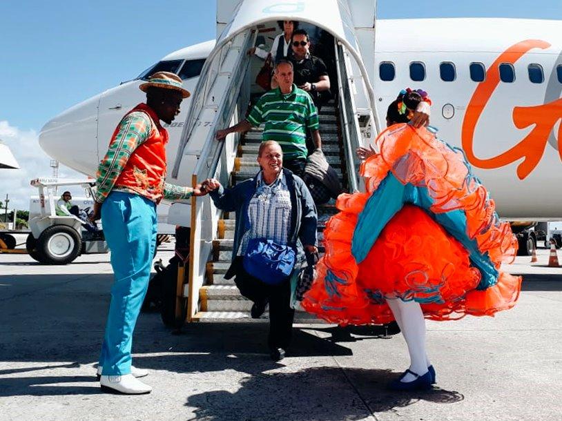 Ainda na pista, os visitantes eram recebidos por uma equipe da Semict e casal de dançarinos. “Fizemos questão de esperar os visitantes na descida do avião para que eles sintam o quanto são bem-vindos à nossa terra e também convidá-los a vivenciar a nossa cultura da tradição do forró. Sentir o nosso calor humano, a nossa hospitalidade, o nosso bem receber”, destacou a diretora de Turismo da Semict, Luciana Kariny.