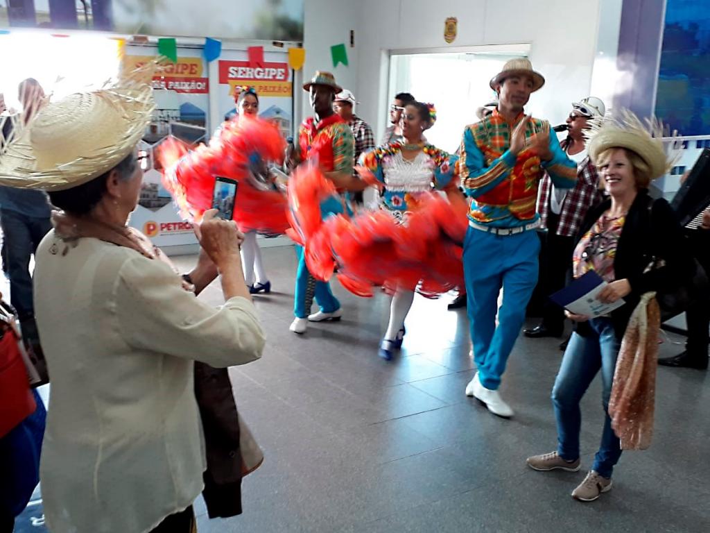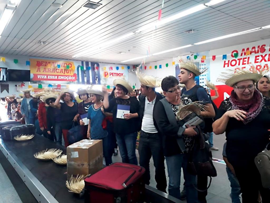 Turistas que chegaram em Aracaju neste sábado, 23, foram recebidos com várias surpresas no Aeroporto Santa Maria. Visando acolher e envolver o visitante nos festejos juninos da cidade, a Prefeitura de Aracaju, através da Secretaria Municipal da Indústria, Comércio e Turismo (Semict), promoveu uma série de ações para receber quem desembarcava.