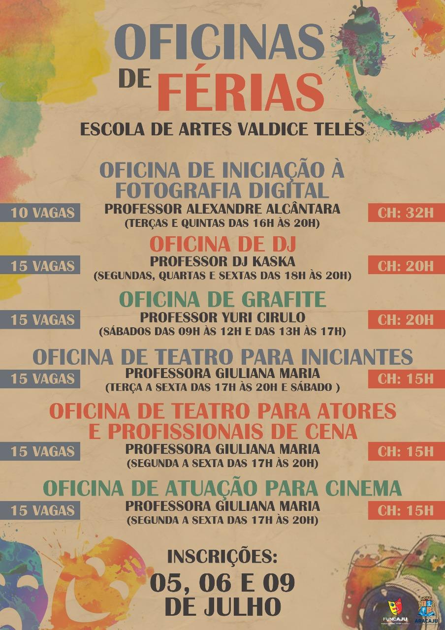A Escola de Artes Valdice Teles inicia nesta quinta-feira, 5, as inscrições para oficinas de férias nas áreas de fotografia, música, grafite e teatro. As aulas serão ministradas de 10 de julho a 11 de agosto, na própria unidade, que é vinculada à Fundação Cultural Cidade de Aracaju (Funcaju).