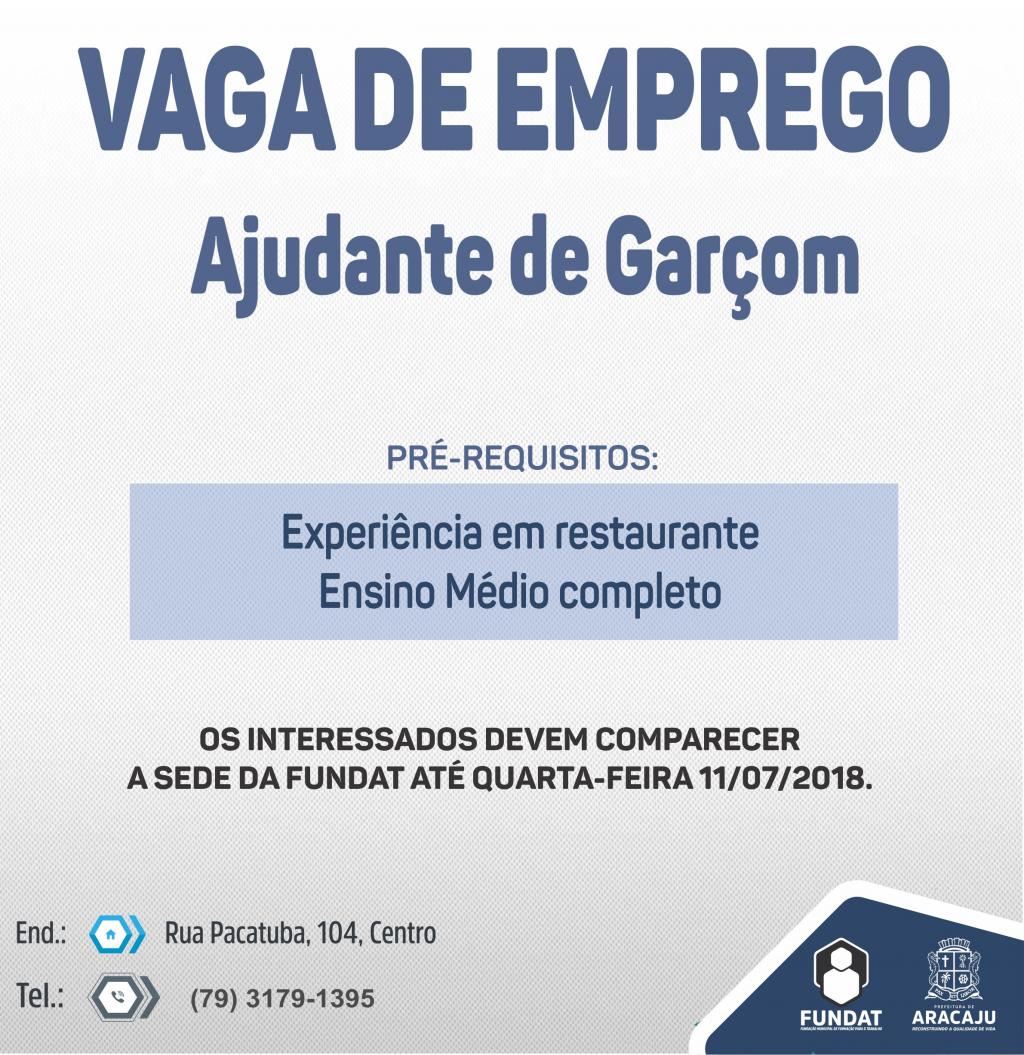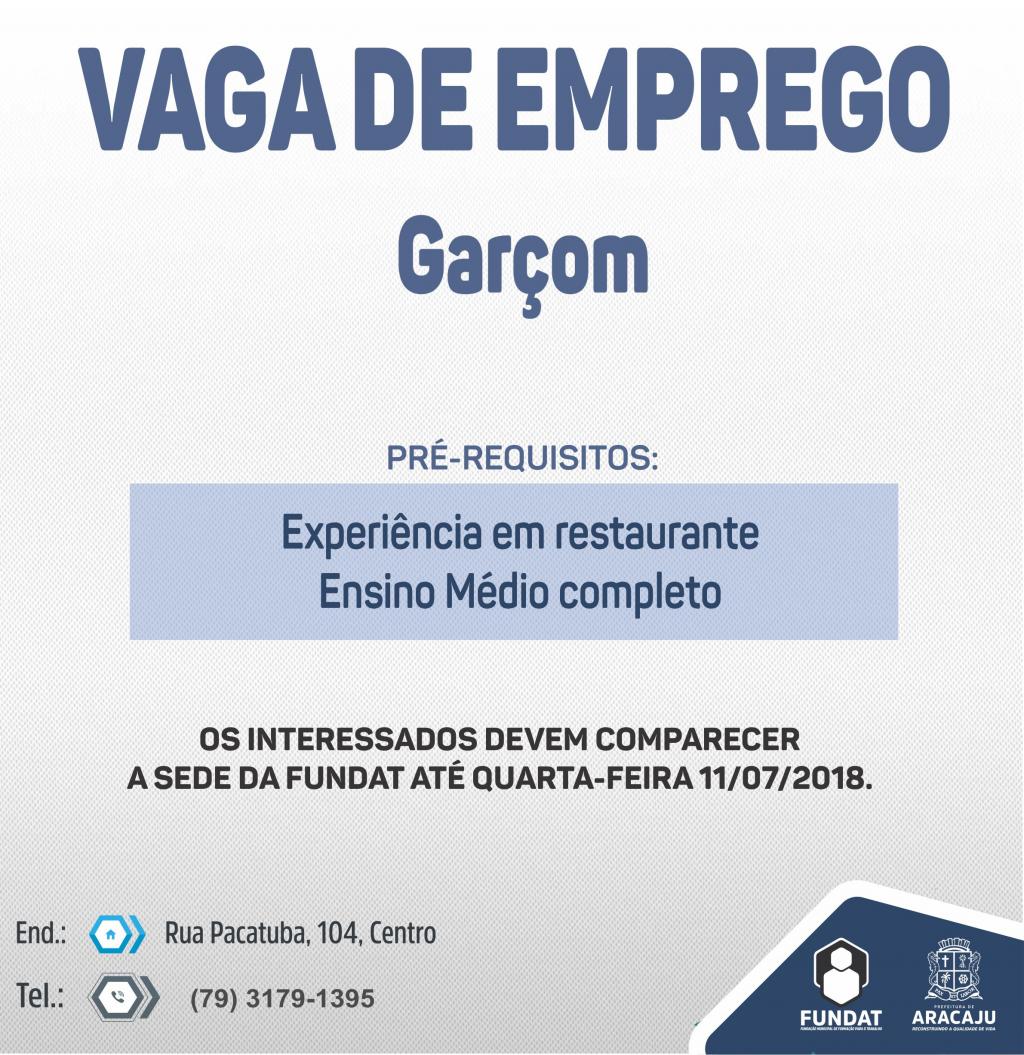 Para participar dos processos seletivos, é necessário ter ensino médio completo e experiência em restaurante.Os interessados em concorrer às vagas devem comparecer à sede da Fundat até a próxima quarta-feira, 11 de julho de 2018. O horário de atendimento é de segunda a sexta, das 7h30 às 17h. Para mais informações, entrar em contato através do telefone (79) 3179-1395.
