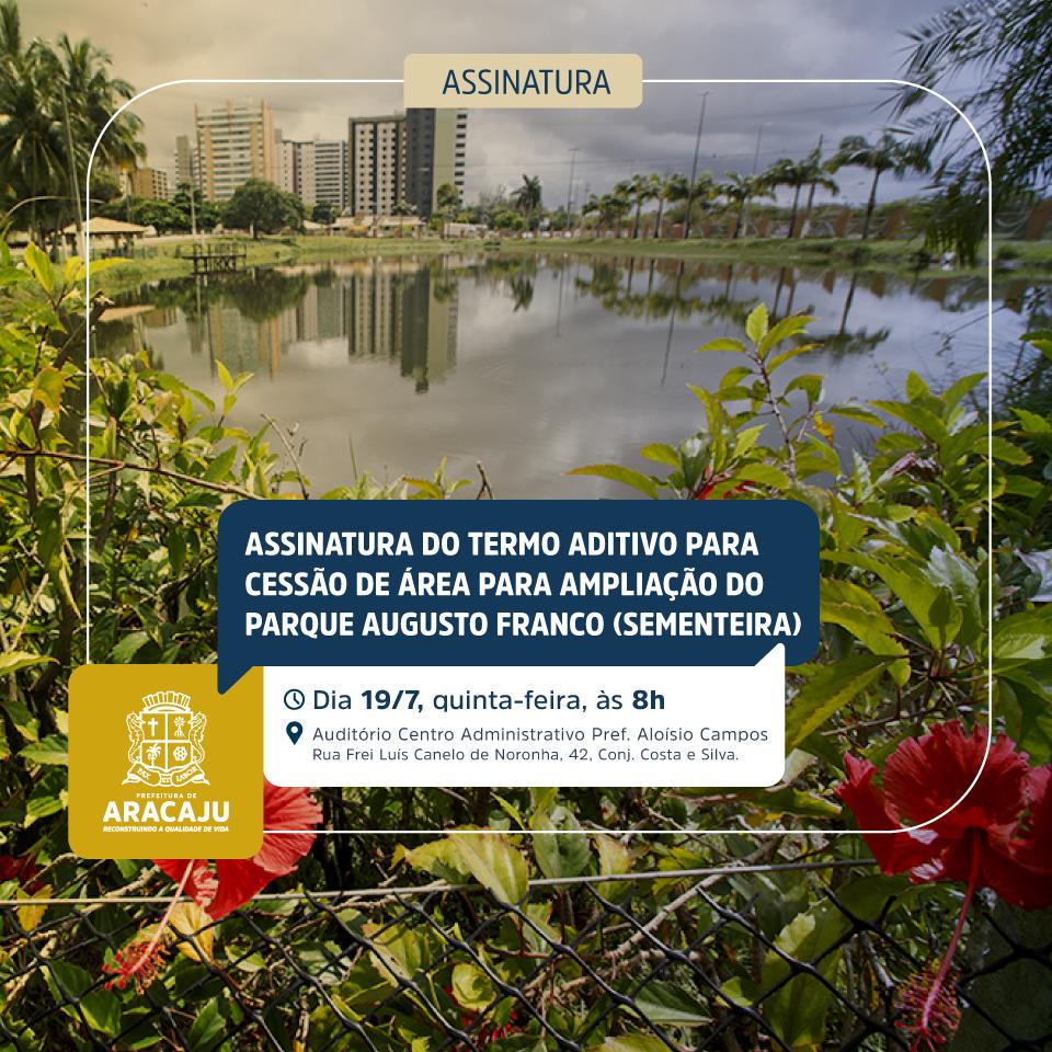 O prefeito Edvaldo Nogueira e o chefe-geral da Empresa Brasileira de Pesquisa Agropecuária (Embrapa), Marcelo Ferreira Fernandes, convidam a todos para o ato de assinatura do termo aditivo para cessão de área para ampliação do Parque Augusto Franco (Sementeira). A solenidade acontece nesta quinta-feira, 19, às 8h, no auditório do Centro Administrativo Professor Aloísio Campos, localizado na rua Frei Luiz Canelo de Noronha, n° 42, conjunto Costa e Silva.