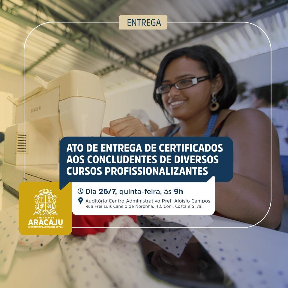 O prefeito Edvaldo Nogueira e a secretária Municipal da Assistência Social, Rosane da Cunha e Silva, convidam a todos para o ato de entrega de certificados aos concludentes dos cursos de assistente administrativo, porteiro e vigia, agente de limpeza e conservação, básico de escova, preparo de doces e salgados, e costureiro. A solenidade acontece nesta quinta-feira, 26, às 9h, no auditório do Centro Administrativo Professor Aloísio Campos, localizado na rua Frei Luiz Canelo de Noronha, n° 42, conjunto Costa e Silva.