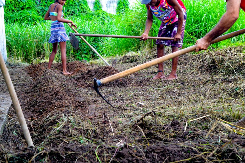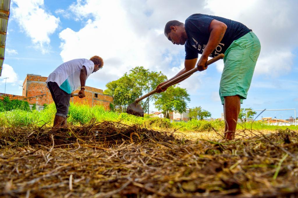 Alface, tomate, coentro, cebola. O que não vai faltar é espaço para deixar a grande plantação rica e diversificada. No local, foi disponibilizada uma tarefa de terra, o equivalente a três mil metros quadrados. Nesta quarta-feira, 1º de agosto, os usuários já estiveram no terreno para conhecer e até colocar a mão na massa. Hoje, por exemplo, foram construídas as primeiras colunas da plantação.