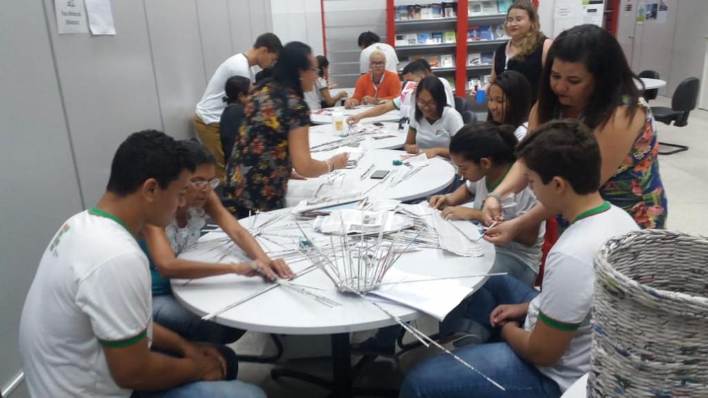 Os estudantes do 2º e 3º ano tiveram contato com as práticas iniciais para a reciclagem de papel. No primeiro momento eles aprenderam a seleção, corte dos jornais e a produção dos canudos. Já na segunda etapa, compreenderam o trançado e deram forma aos objetos, com o auxílio das quatro artesãs da Oficina. Ao todo foram produzidas 15 peças.
