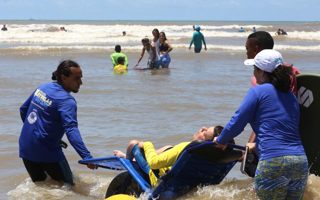 Uma das grandes vantagens de morar na região litorânea é ter a praia bem perto e poder desfrutar da vista ou da sensação de um banho de mar sempre que quiser ou puder. Mas, para algumas pessoas, ter este prazer nem sempre é fácil ou simples. Ter a sensação da água batendo nos pés, sentir o gosto salgado e relaxar ao usufruir de um mergulho nas águas mornas e tranquilas do mar de Aracaju pode causar um entusiasmo tão parecido quanto comer a comida favorita pela primeira vez e é justamente essa emoção que as cerca de 130 pessoas assistidas pela Organização Estrelas do Mar têm tido há sete anos e que, em 2018, pode ser ampliada graças ao Projeto Praia para Todos, uma iniciativa da Prefeitura de Aracaju, por meio da Secretaria Municipal da Juventude e do Esporte (Sejesp) em parceria com o Governo do Estado, Ministério Público Estadual, universidades e conselhos das pessoas com deficiência.