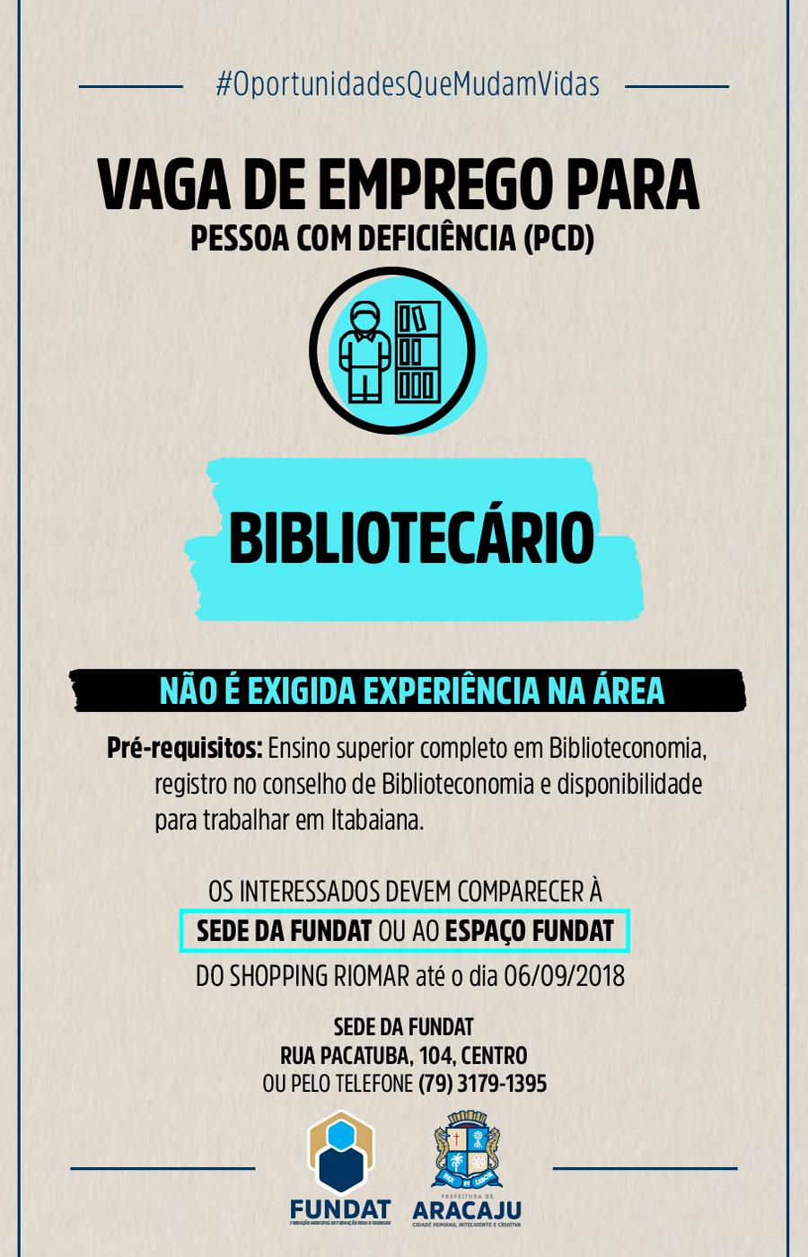 A Agência do Trabalhador, setor da Fundação Municipal de Formação para o Trabalho (Fundat), responsável pelo encaminhamento de cidadãos ao mercado de trabalho, está com oportunidade de emprego destinada à pessoa com deficiência (PCD). Desta vez, a vaga é para bibliotecário, e para participar do processo seletivo, é necessário ter o ensino superior completo em Biblioteconomia, registro no conselho de biblioteconomia e disponibilidade para trabalhar na cidade de Itabaiana.