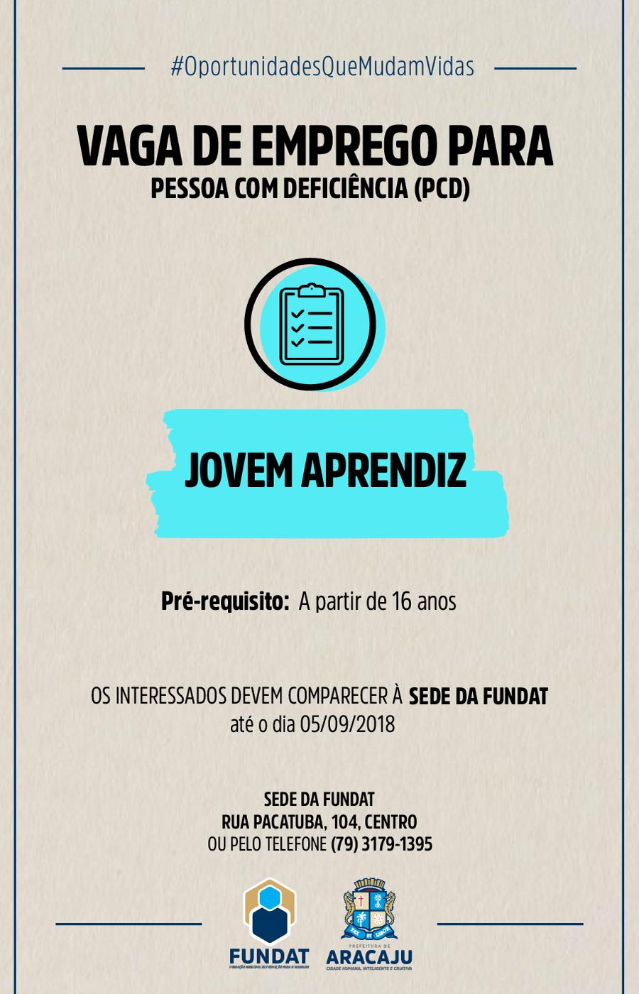 A Fundação Municipal de Formação para o Trabalho (Fundat), por meio da Agência do Trabalhador, setor responsável pelo encaminhamento de cidadãos ao mercado de trabalho, anuncia mais uma oportunidade de emprego destinada à pessoa com deficiência (PCD). Desta vez a vaga é para jovem aprendiz. Para participar do processo seletivo é necessário ter a partir de 16 anos de idade.