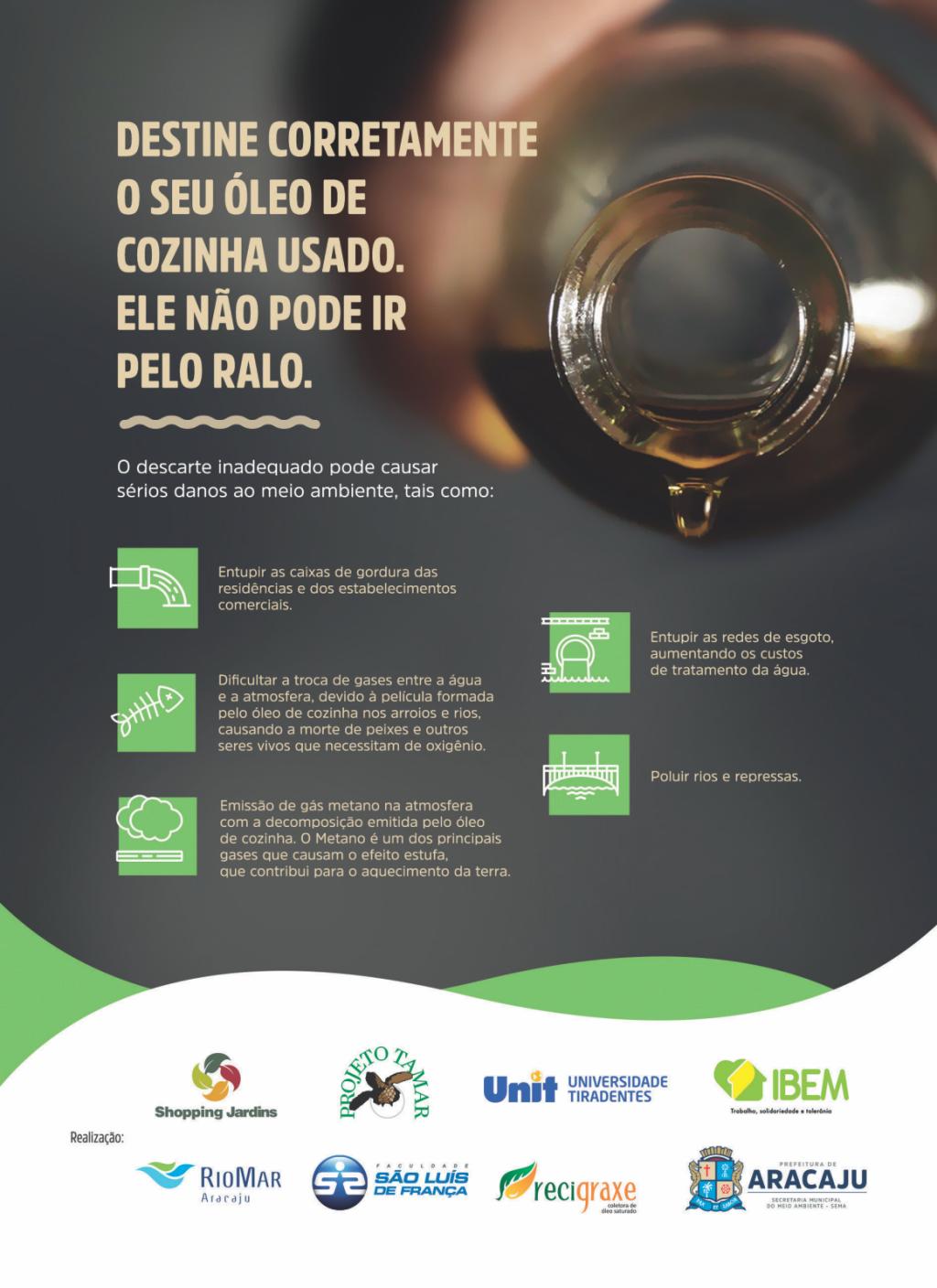 A coordenadora de Educação Ambiental da Sema, Raphaella Ribeiro, destaca a importância de realizar o descarte correto do óleo de cozinha saturado. “Um litro de óleo pode poluir cerca de 20 mil litros de água, gerando assim a mortandade de animais devido o bloqueio da passagem de ar e luz, impedindo a respiração e a fotossíntese. Se for para a rede de esgoto, o óleo também encarece o tratamento dos resíduos. Esse óleo que atinge os rios provoca a impermeabilização dos leitos e terrenos adjacentes, o que contribui também para ocorrência de enchentes. Por isso, as pessoas precisam saber como e onde destinar esses resíduos de forma correta, pois muitas acabam descartando na pia de cozinha ou em outro local inadequado por hábito e, por falta de informação, acaba agredindo o meio ambiente”, afirma.