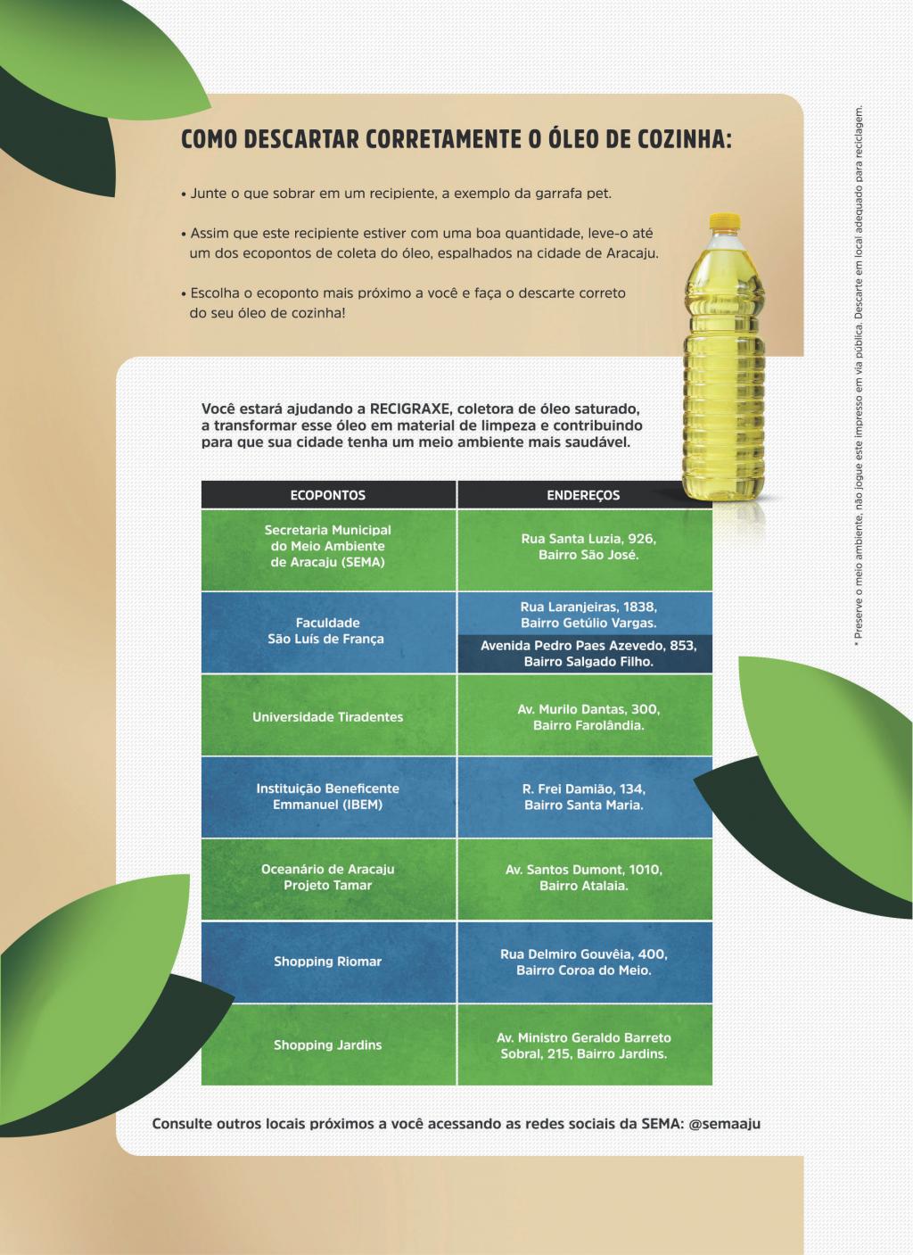 Além da Sema, diversos pontos de coleta de óleo de cozinha usado estão espalhados pela capital sergipana, em instituições de ensino superior, empresas privadas e demais entidades. O cidadão interessado em descartar esse material, basta se dirigir aos seguintes pontos: