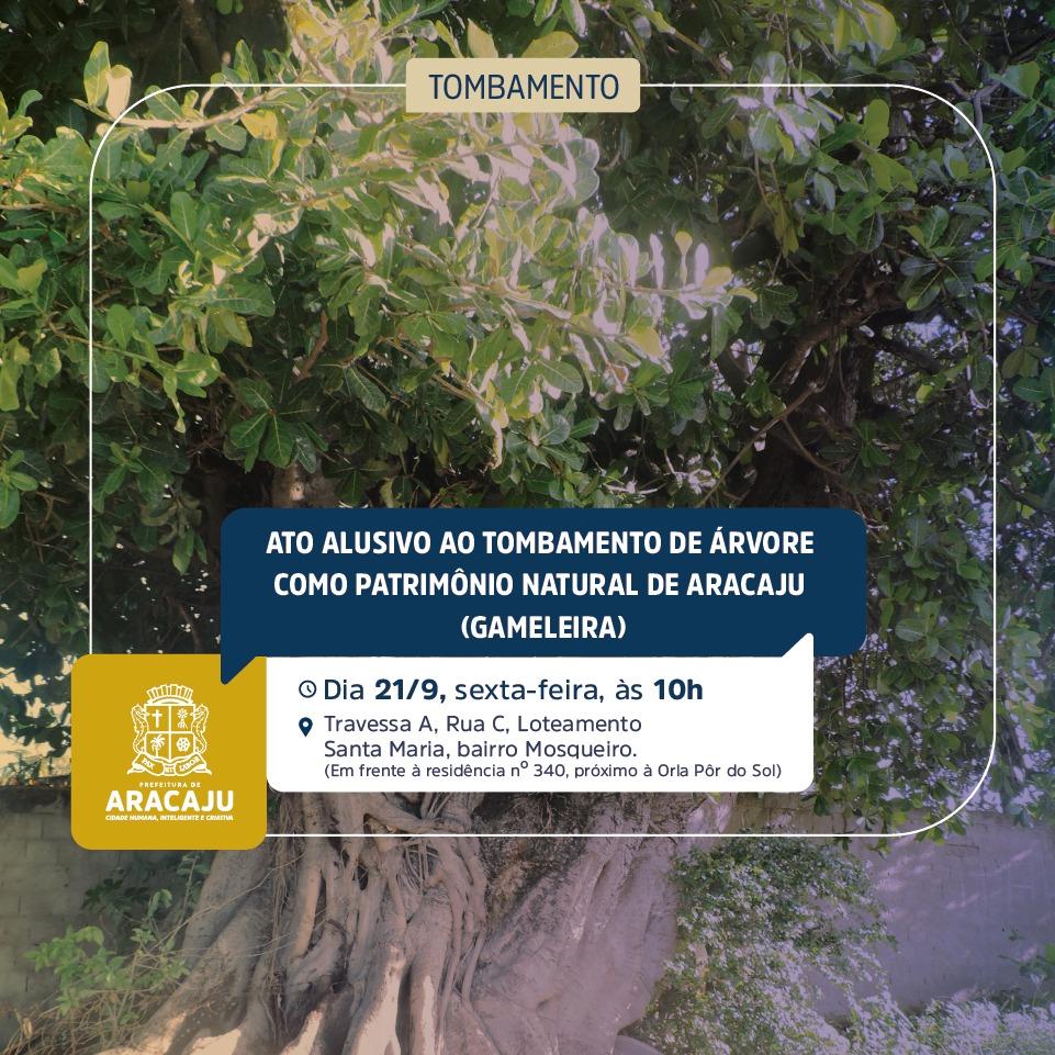 O secretário municipal do Meio Ambiente de Aracaju, Augusto Cesar Viana, convida a todos para o ato de de tombamento de árvore, conhecida popularmente como gameleira, que receberá o título de Patrimônio Natural de Aracaju.