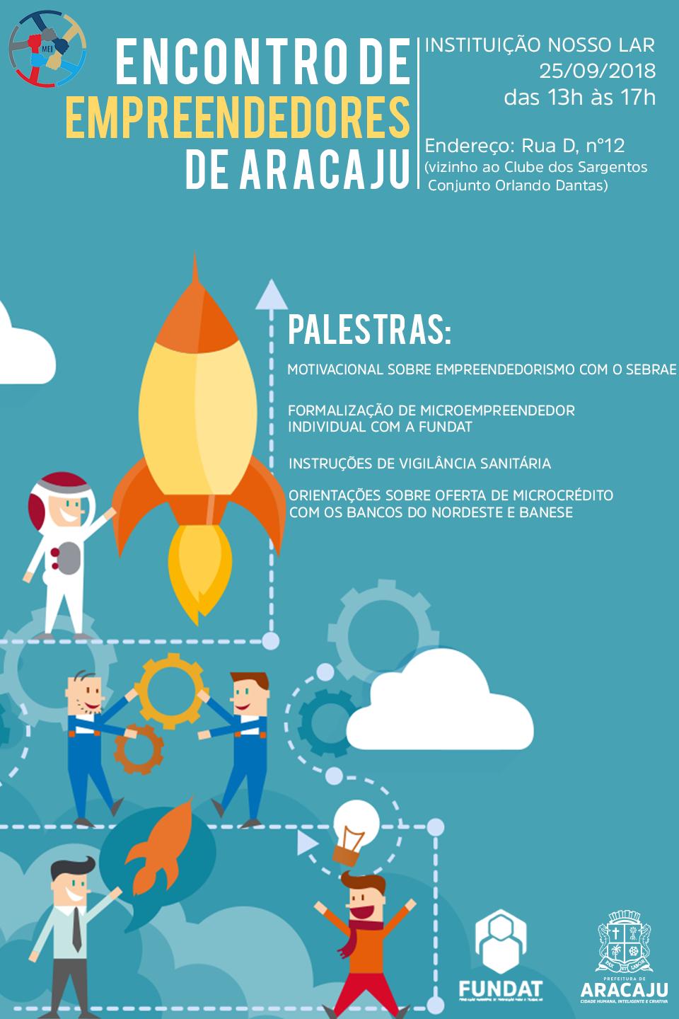 Seguindo com o objetivo de oferecer apoio para que os interessados em abrir o próprio negócio, a Fundação Municipal de Formação para o Trabalho (Fundat), em parceria com o Serviço Brasileiro de Apoio às Micro e Pequenas Empresas (Sebrae), realizará a 5ª edição do Encontro de Empreendedores de Aracaju. Desta vez, o Encontro será realizado das 13h às 17h, na Instituição Nosso Lar, localizada na rua D - 12, vizinho ao Clube dos Sargentos no conjunto Orlando Dantas, dia 25.