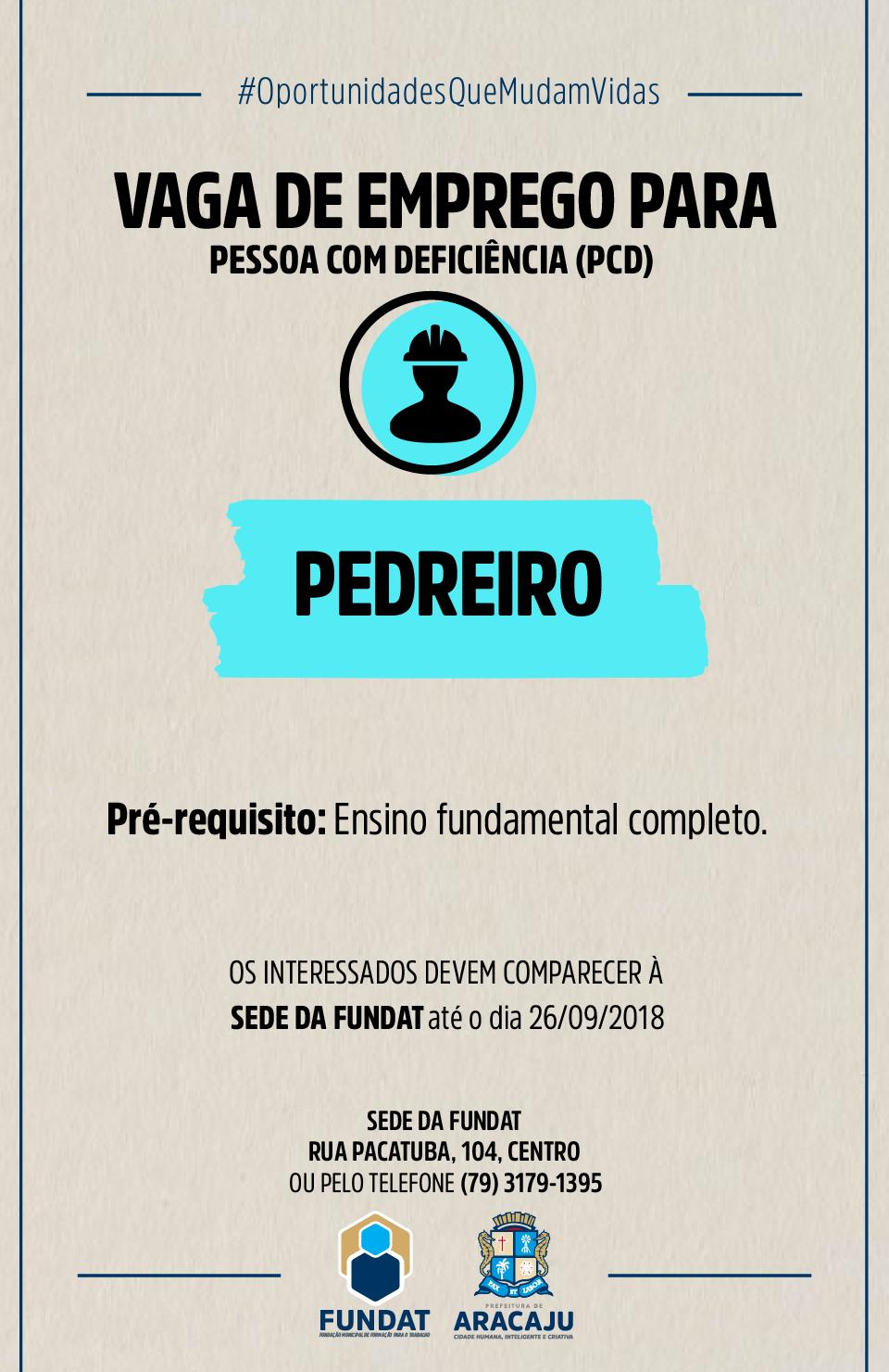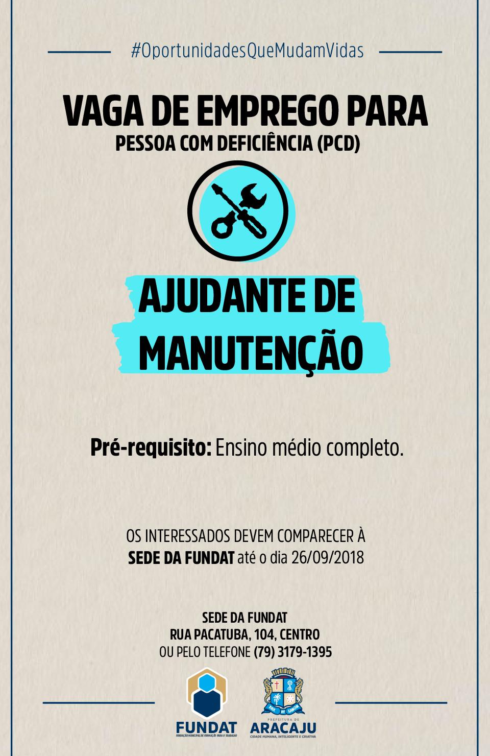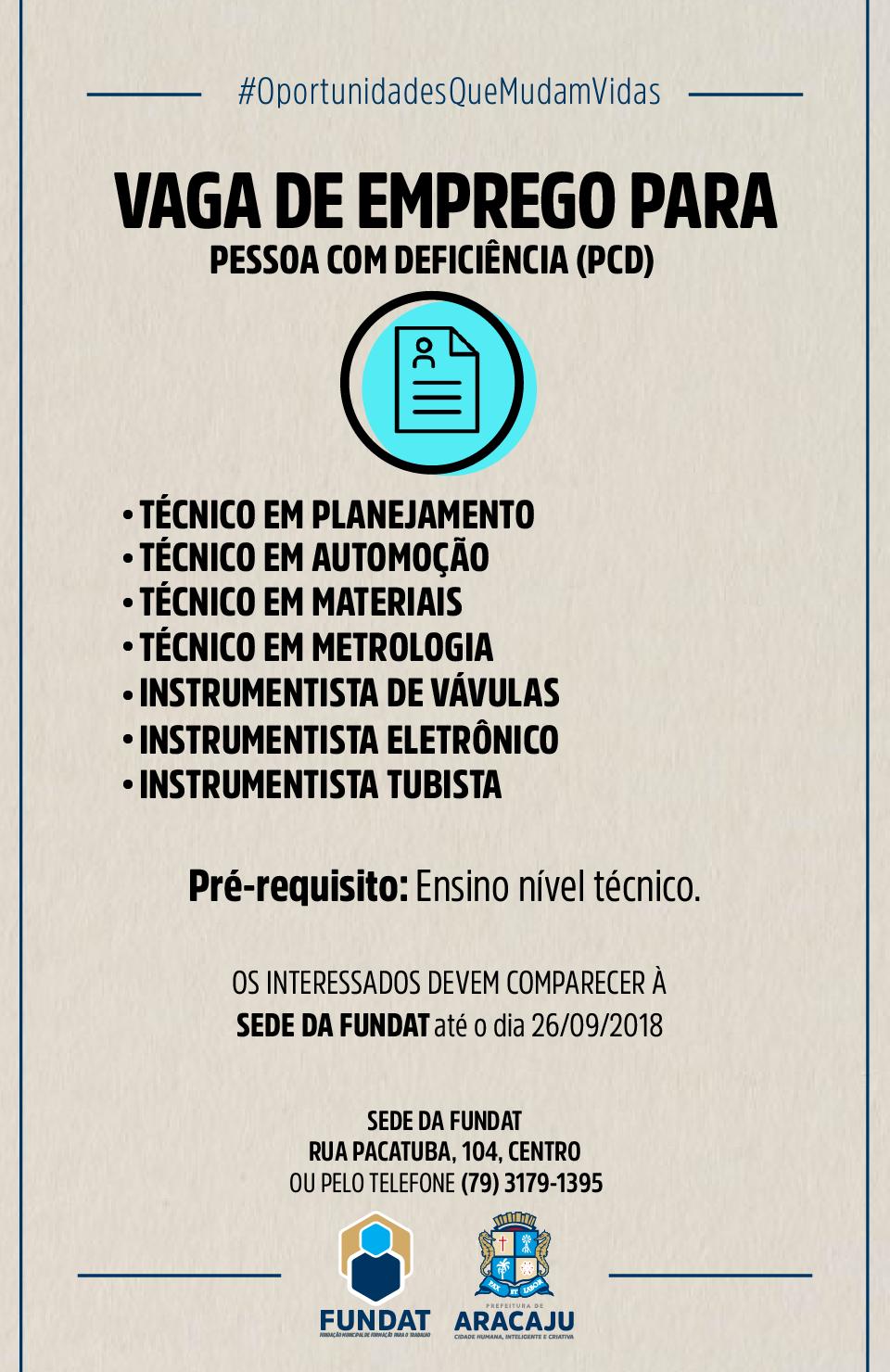 A Fundação Municipal de Formação para o Trabalho (Fundat), por meio da Agência do Trabalhador, setor responsável pelo encaminhamento de cidadãos ao mercado de trabalho, segue ofertando oportunidades de emprego destinadas à pessoa com deficiência (PCD). Desta vez, as vagas são para ajudante de manutenção, técnico em planejamento, instrumentista de válvulas, instrumentista eletrônico, instrumentista tubista, técnico em automação, técnico em materiais, técnico em metrologia e pedreiro.