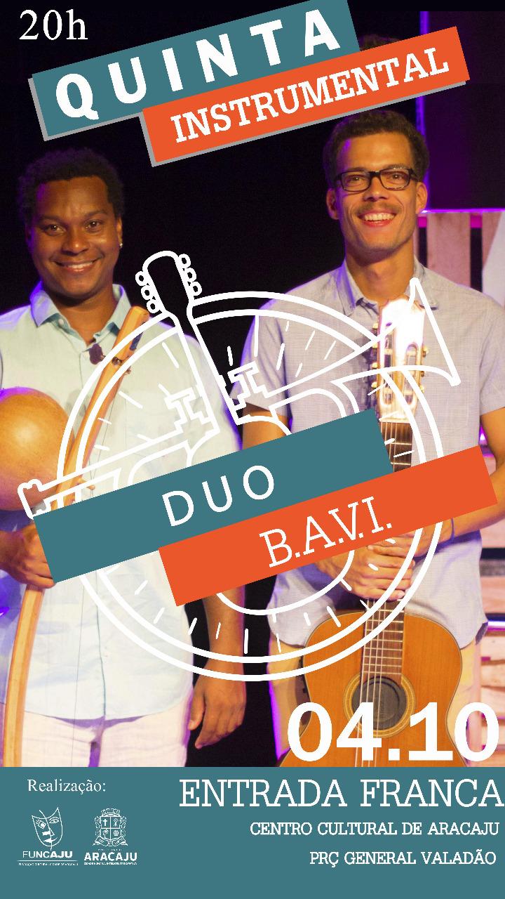 Desenvolvido pela Prefeitura Municipal de Aracaju (PMA) e realizado pela Fundação Cultural Cidade Aracaju (Funcaju) com o propósito de ocupar o centro histórico da capital sergipana com as diversas linguagens das artes, o projeto ‘Quinta Instrumental’ desta semana traz uma dupla talentosa e nada convencional, o Duo B.A.V.I. O show acontecerá às 20h no palco do Teatro João Costa, do Centro Cultural, localizado na praça General Valadão.