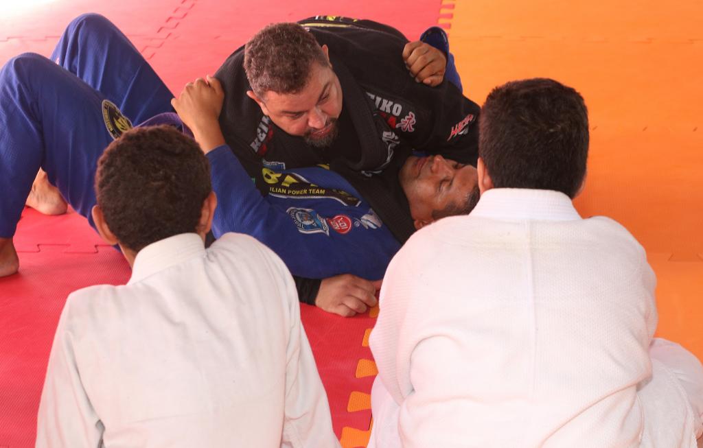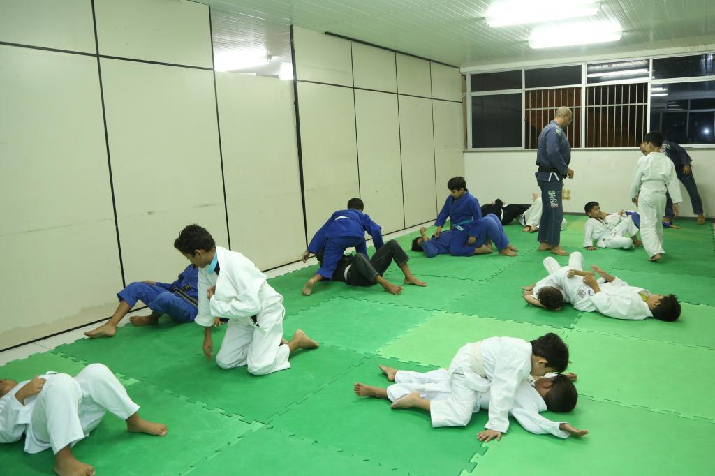 As aulas de jiu-jitsu também são ofertadas na Associação de Moradores do Conjunto Presidente Médici. O responsável pelos treinos é o guarda municipal Anderson Clay da Hora. Ao todo, são 100 alunos, distribuídos em três turnos, sendo o maior número à noite. “O foco do treino é o bem-estar. Naturalmente, a pessoa chega sem condicionamento físico, mas com o tempo vai se condicionando com o grupo. Alguns começam a se destacar e ganham títulos também”, explicou.