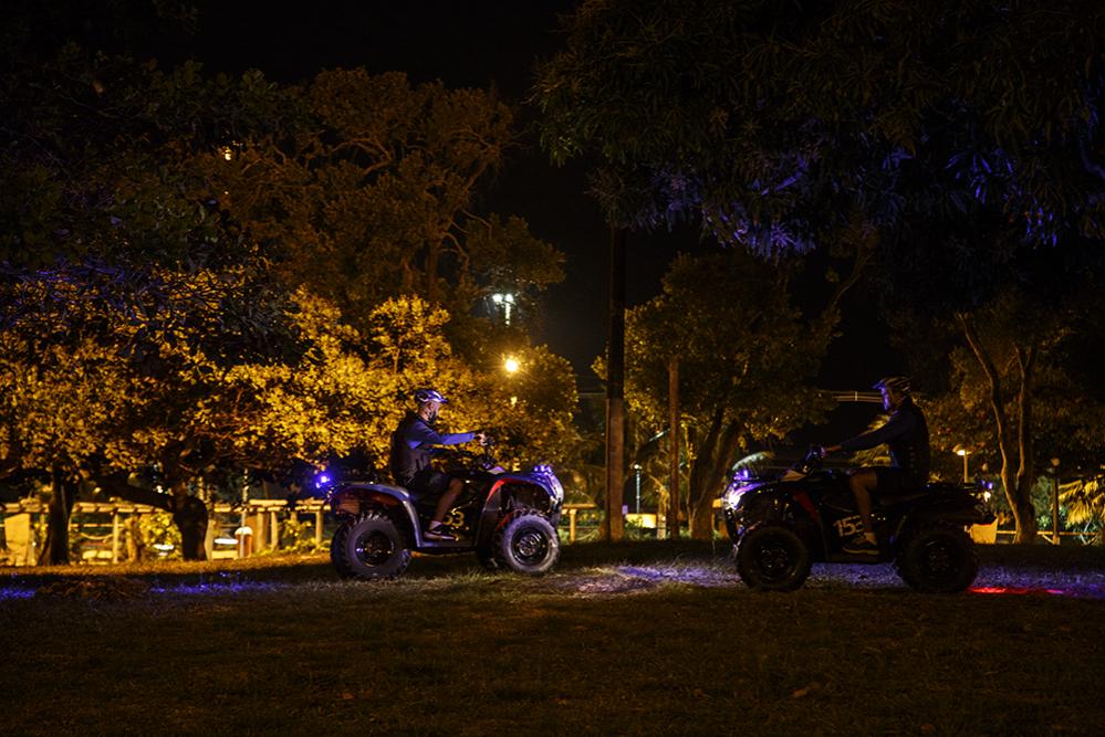O coordenador do ciclopatrulhamento, GM Chystophen Prado, um dos que pilotam os quadriciclos, conta que o patrulhamento começa a ser feito pela tarde a partir das 17h da sexta-feira em todo o parque, durante o final de semana, e em dias de grande movimentação no parque em razão de algum evento.