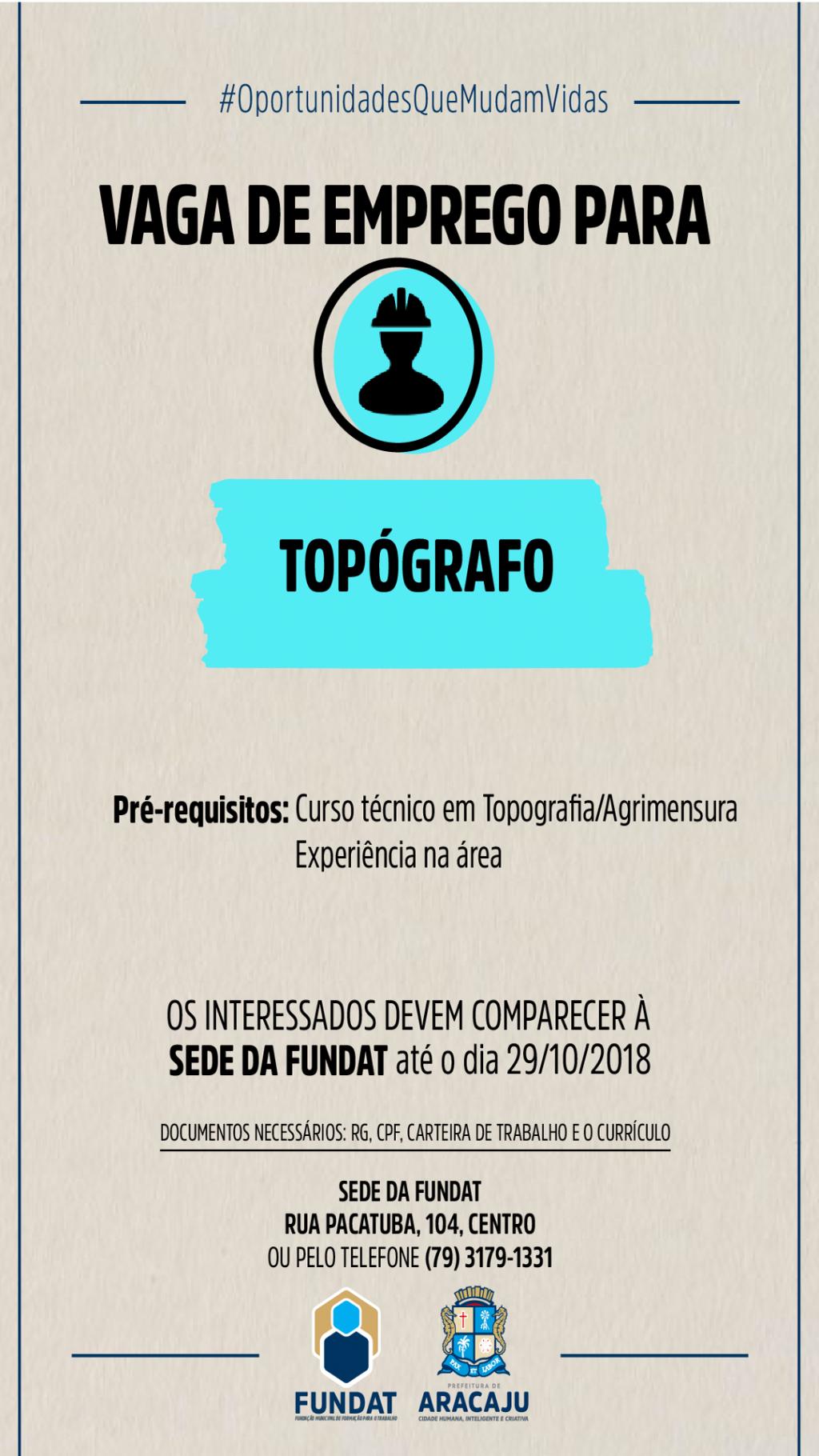 A Fundação Municipal de Formação para o Trabalho (Fundat), por meio da Agência do Trabalhador, setor responsável pelo encaminhamento de cidadãos ao mercado de trabalho, informa que está com vagas de emprego para topógrafo e auxiliar de topógrafo.