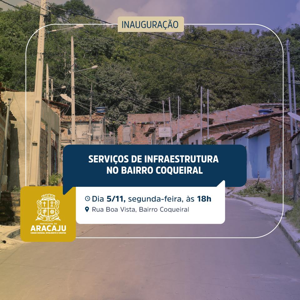 O prefeito Edvaldo Nogueira e o presidente da Empresa Municipal de Obras e Urbanização (Emurb), Antônio Sérgio Ferrari, convidam para a inauguração dos serviços de infraestrutura no bairro Coqueiral. A solenidade acontece nesta segunda-feira, 5, às 18h, na rua Boa Vista, bairro Coqueiral.