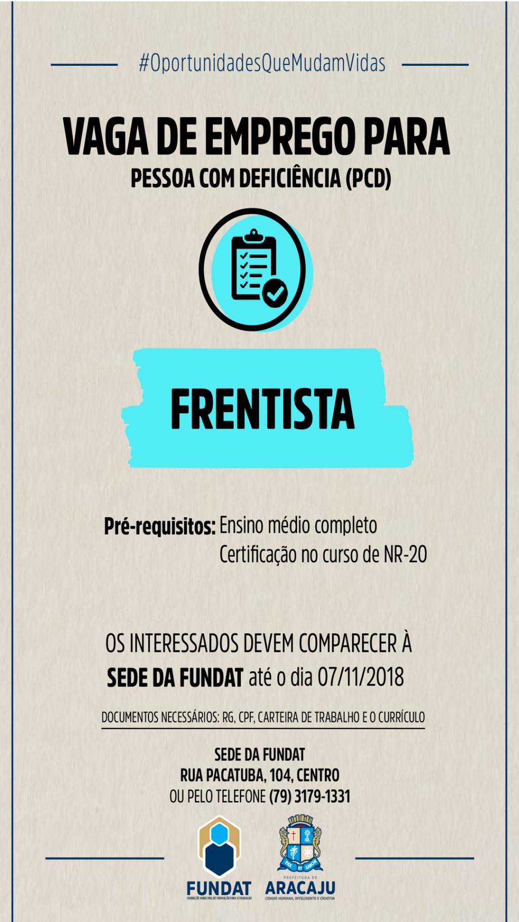 Através da Agência do Trabalhador, setor responsável pelo encaminhamento de mão de obra qualificada ao mercado de trabalho, a Fundação Municipal de Formação para o Trabalho (Fundat) anuncia vaga de emprego para pessoa com deficiência (PCD), destinada à função de frentista.