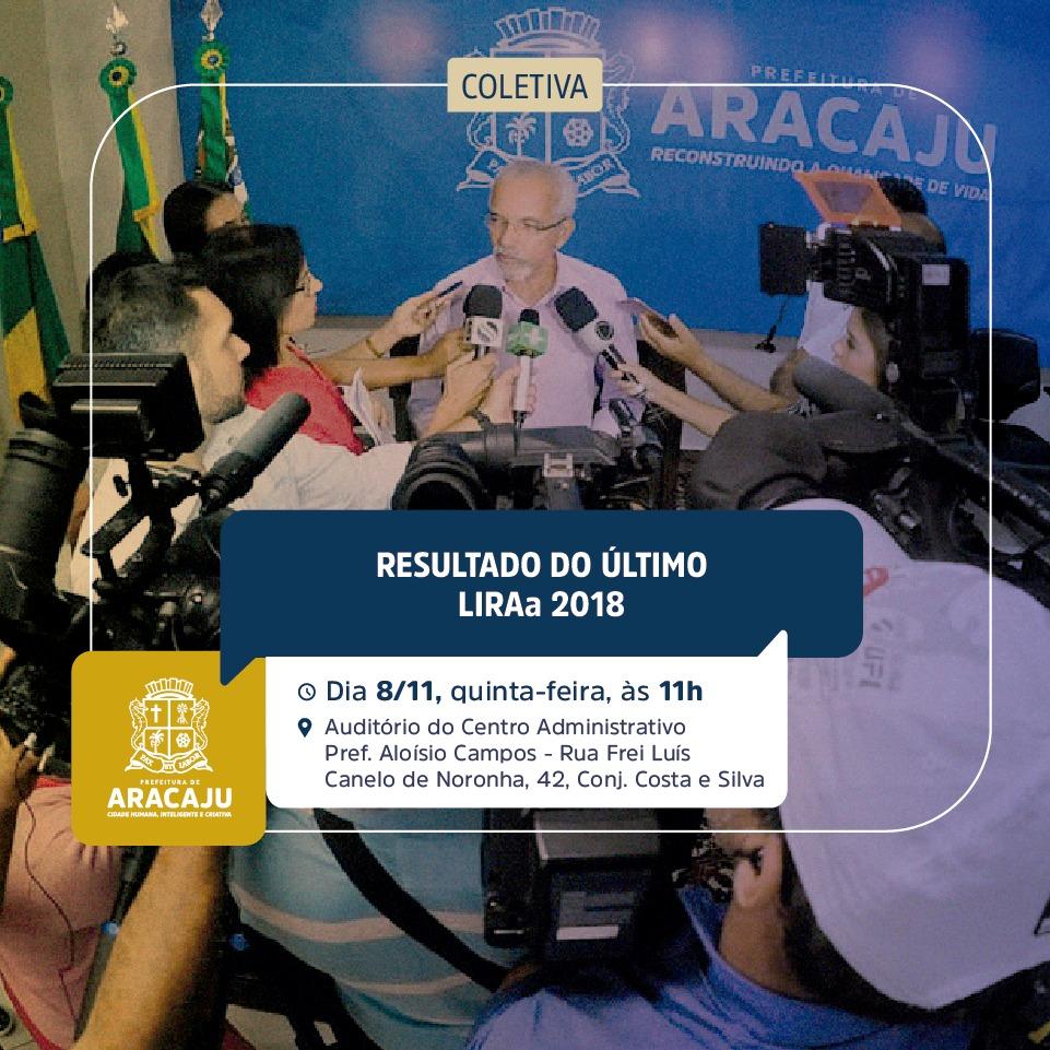 O prefeito Edvaldo Nogueira e a secretária municipal da Saúde, Waneska Barboza, convidam a todos para a coletiva de imprensa para apresentação do sexto e último Levantamento de Índice Rápido do Aedes (LIRAa) do ano de 2018. Será nesta quinta-feira, 8, às 11h, no auditório do Centro Administrativo Prefeito Aloísio Campos, localizado no bairro Siqueira Campos.