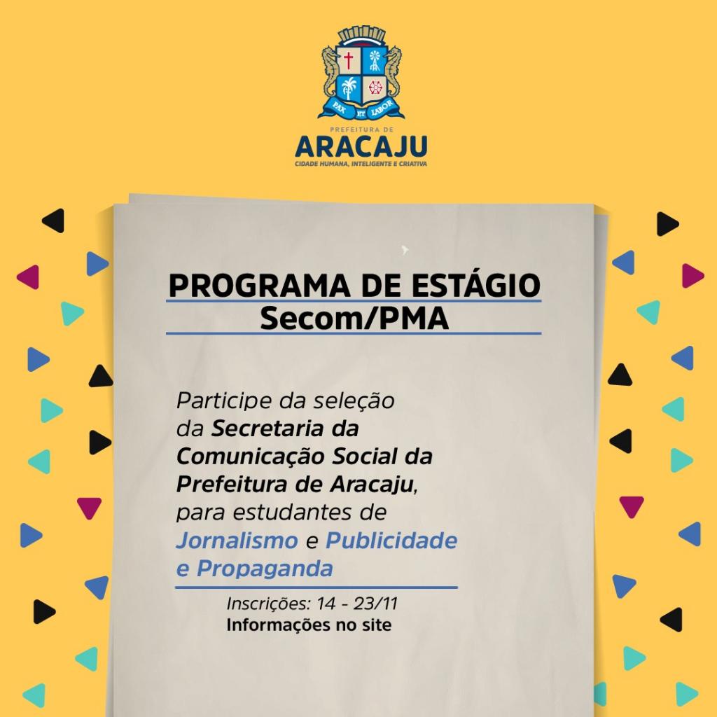 A Secretaria Municipal da Comunicação (Secom) da Prefeitura de Aracaju abre processo seletivo para contratação de estagiários. São três vagas, com carga horária de quatro horas em turno a ser definido, distribuídas entre a Redação (duas) e o Núcleo de Mídias Digitais (uma). Os interessados em participar da seleção devem enviar o currículo entre os dias 14 e 23 de novembro.